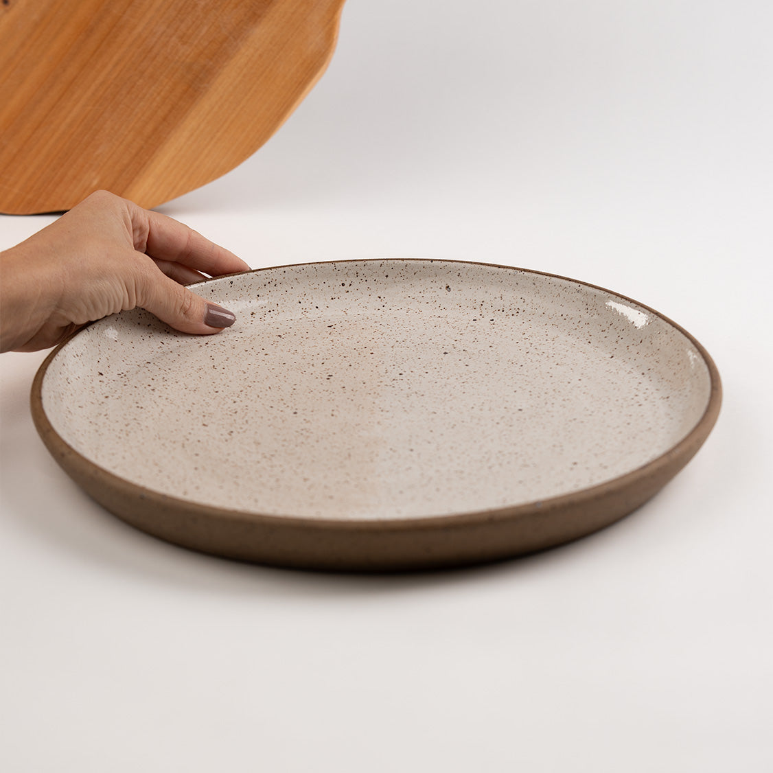Bandeja Redonda sem alça em cerâmica artesanal, feita à mão com forma limpa e presença discreta. O formato circular e sem alças confere leveza visual e permite usos diversos: como base para composições, apoio de xícaras, potes ou até como centro de mesa. A simplicidade do desenho valoriza o acabamento da cerâmica e o toque autoral da peça.