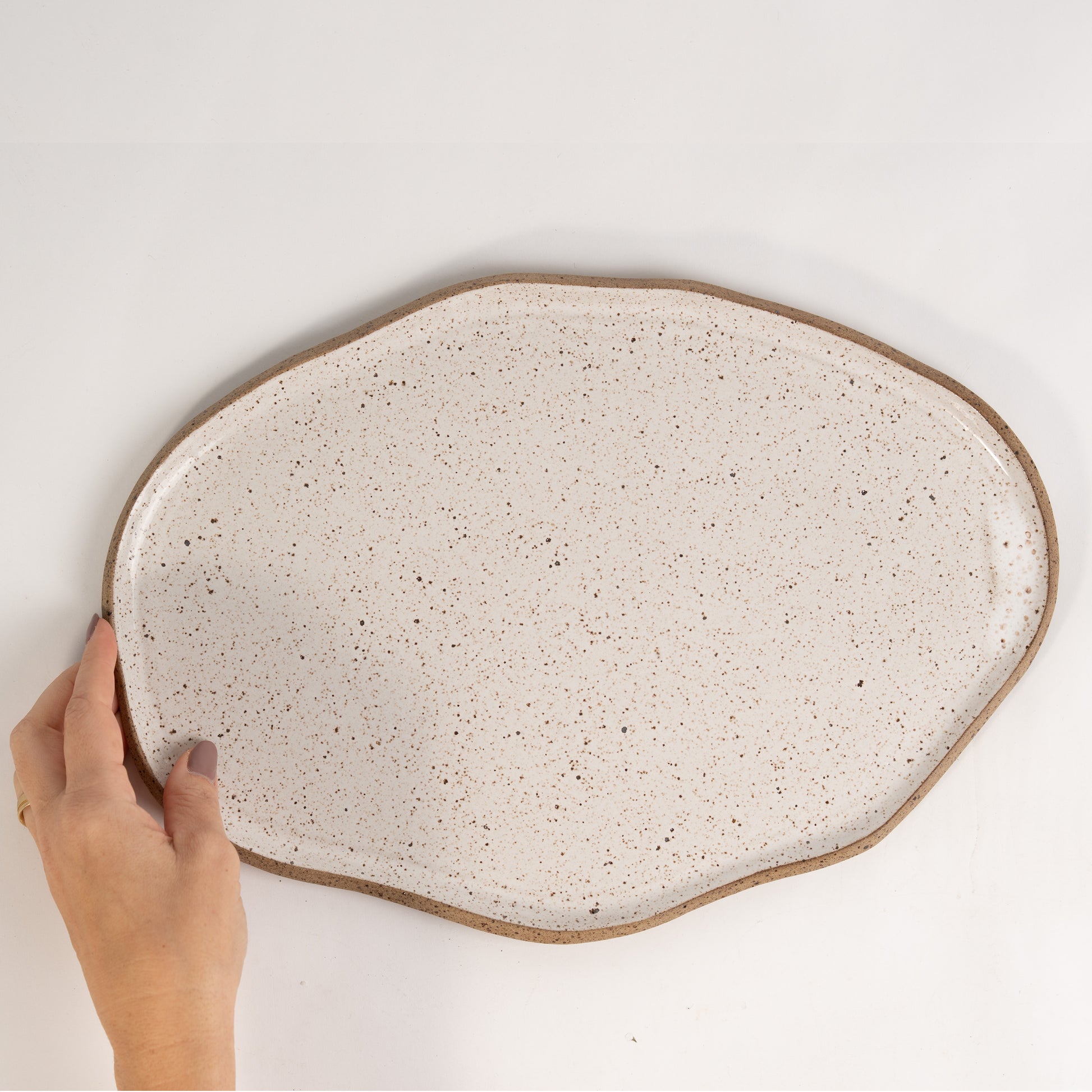 Feita manualmente com argilas de alta qualidade, sua forma retangular com bordas orgânicas permite usos diversos: servir petiscos, apoiar objetos decorativos ou compor uma mesa posta com personalidade. Cada peça é única, com variações naturais de cor, textura e forma.