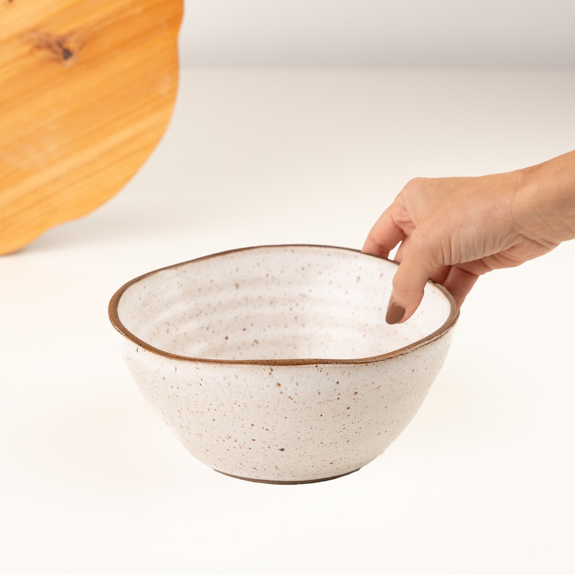 O Bowl Encontro redondo orgânico é uma peça de cerâmica artesanal que valoriza o gesto espontâneo e o contorno imperfeito. Seu formato redondo com leve irregularidade orgânica reforça a identidade da linha Encontro, onde cada peça carrega a naturalidade do feito à mão.