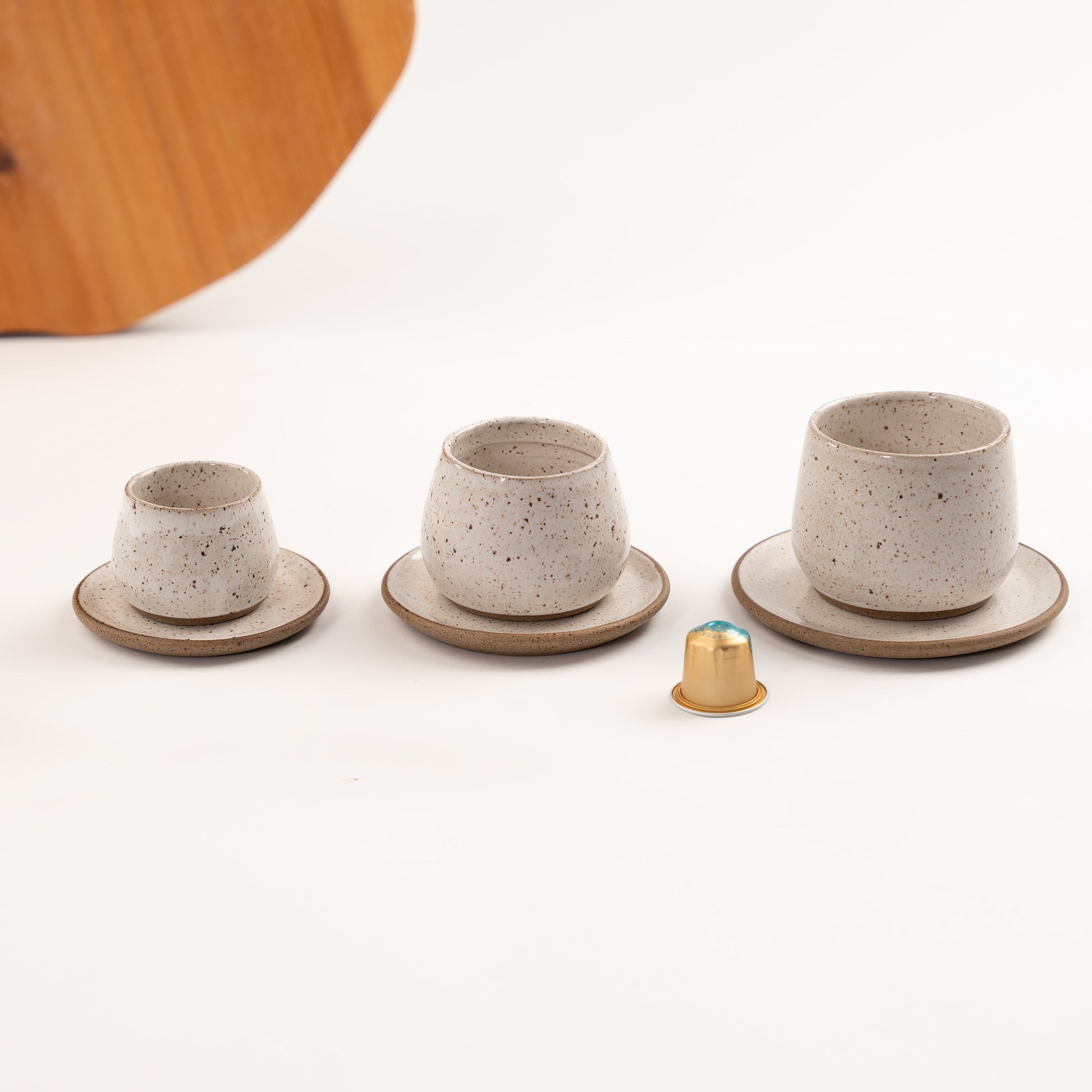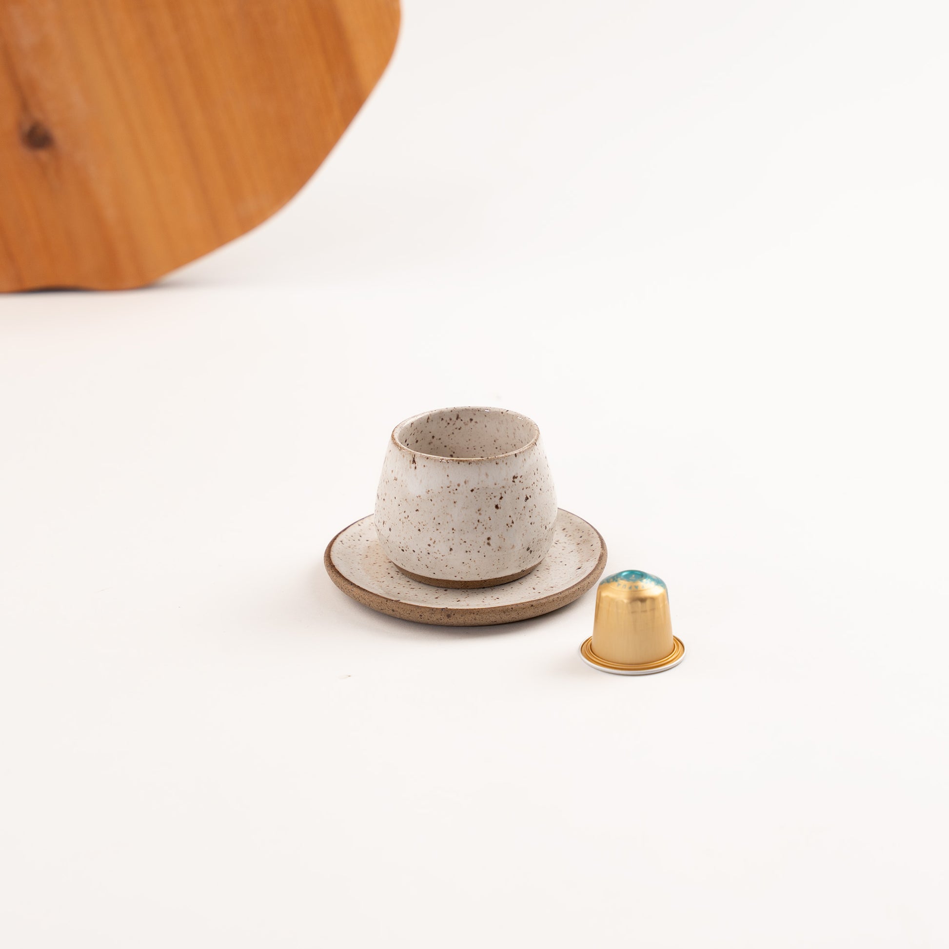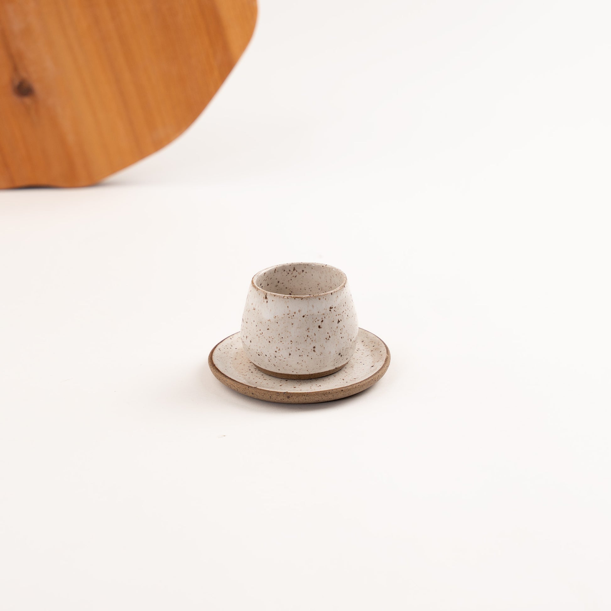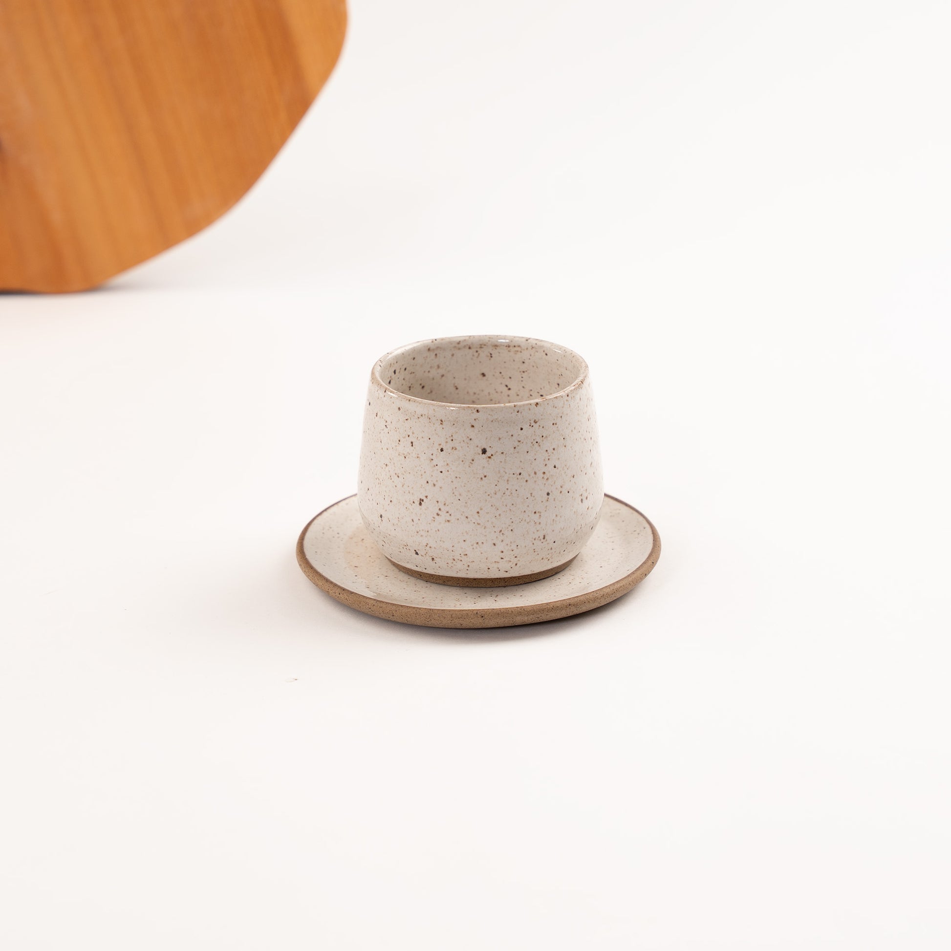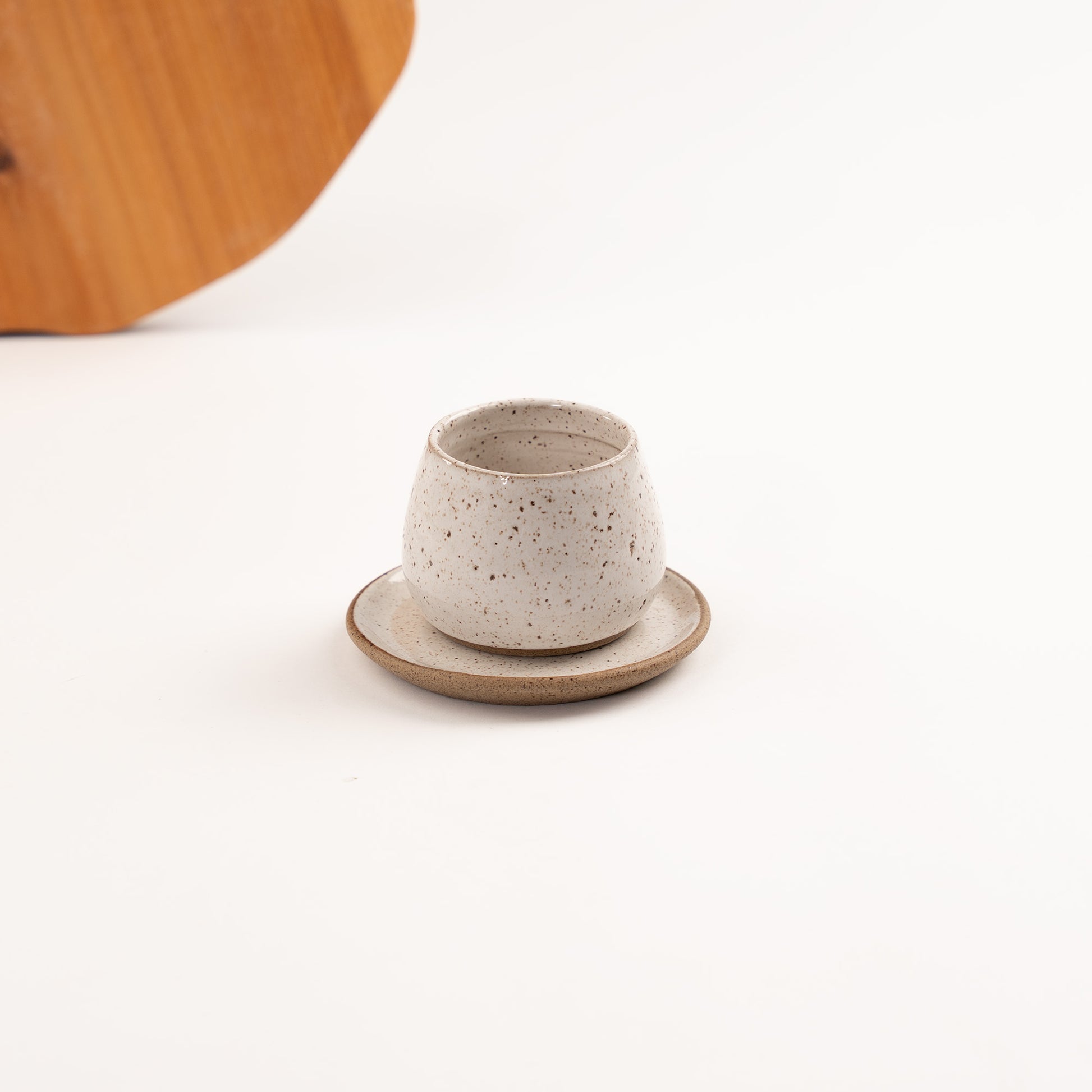Copinho Cumbuca com pires em cerâmica artesanal, feito à mão com formas suaves e acabamento delicado. O conjunto valoriza os pequenos momentos, ideal para servir café, chás ou infusões com cuidado e presença.