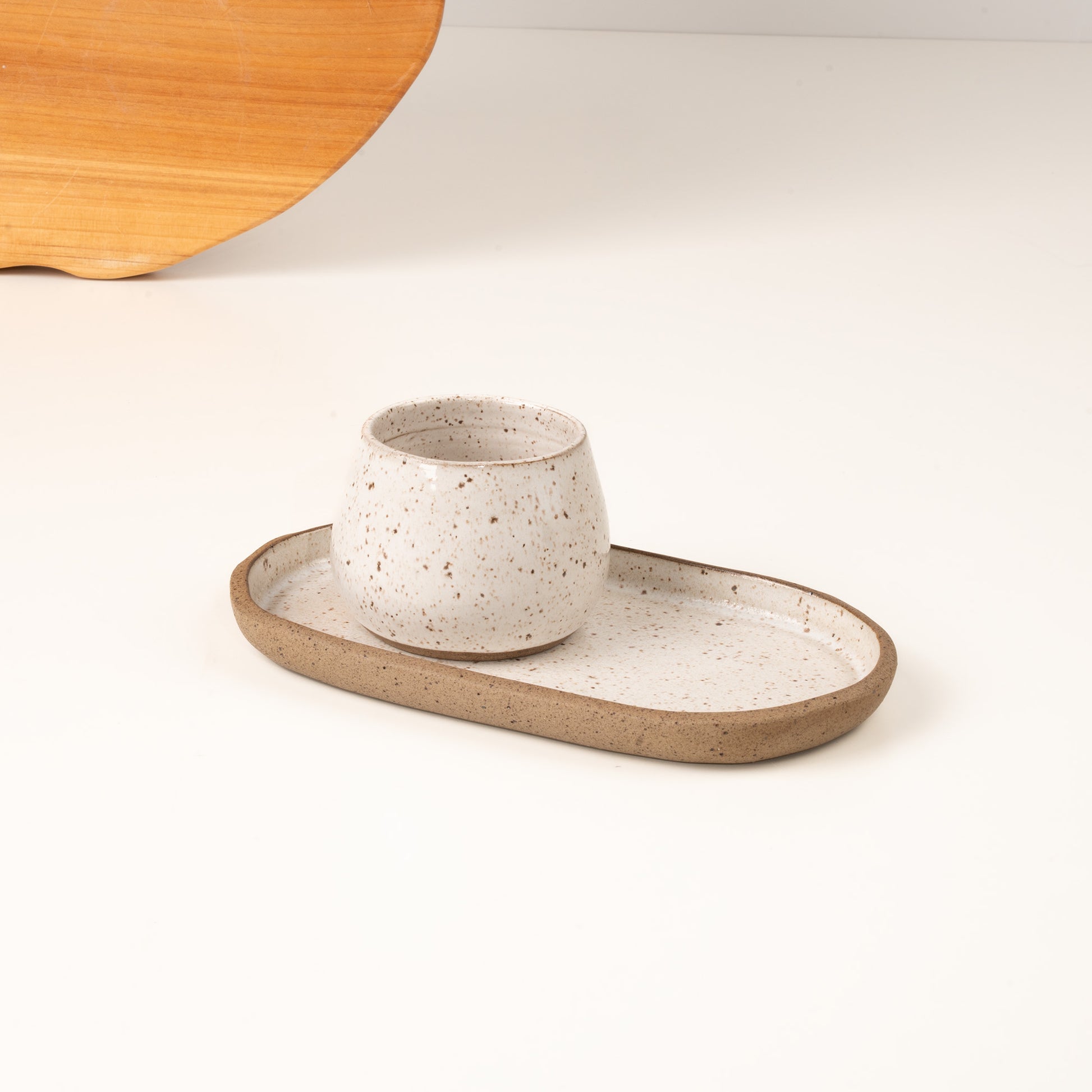 Copinho Cumbuca com pires alongado em cerâmica artesanal, feito à mão com formas orgânicas e acabamento que valoriza o toque humano. O pires em formato alongado oferece mais espaço de apoio, ideal para acompanhar o copinho com pequenos itens como colher ou um docinho.