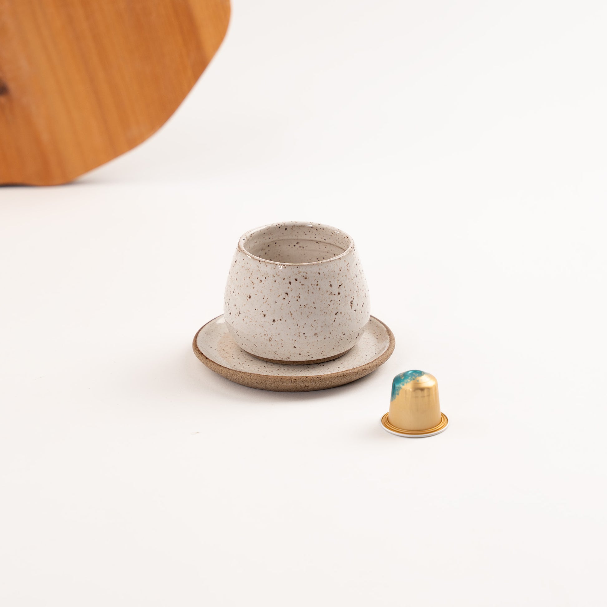 Copinho Cumbuca com pires em cerâmica artesanal, feito à mão com formas suaves e acabamento delicado. O conjunto valoriza os pequenos momentos, ideal para servir café, chás ou infusões com cuidado e presença.