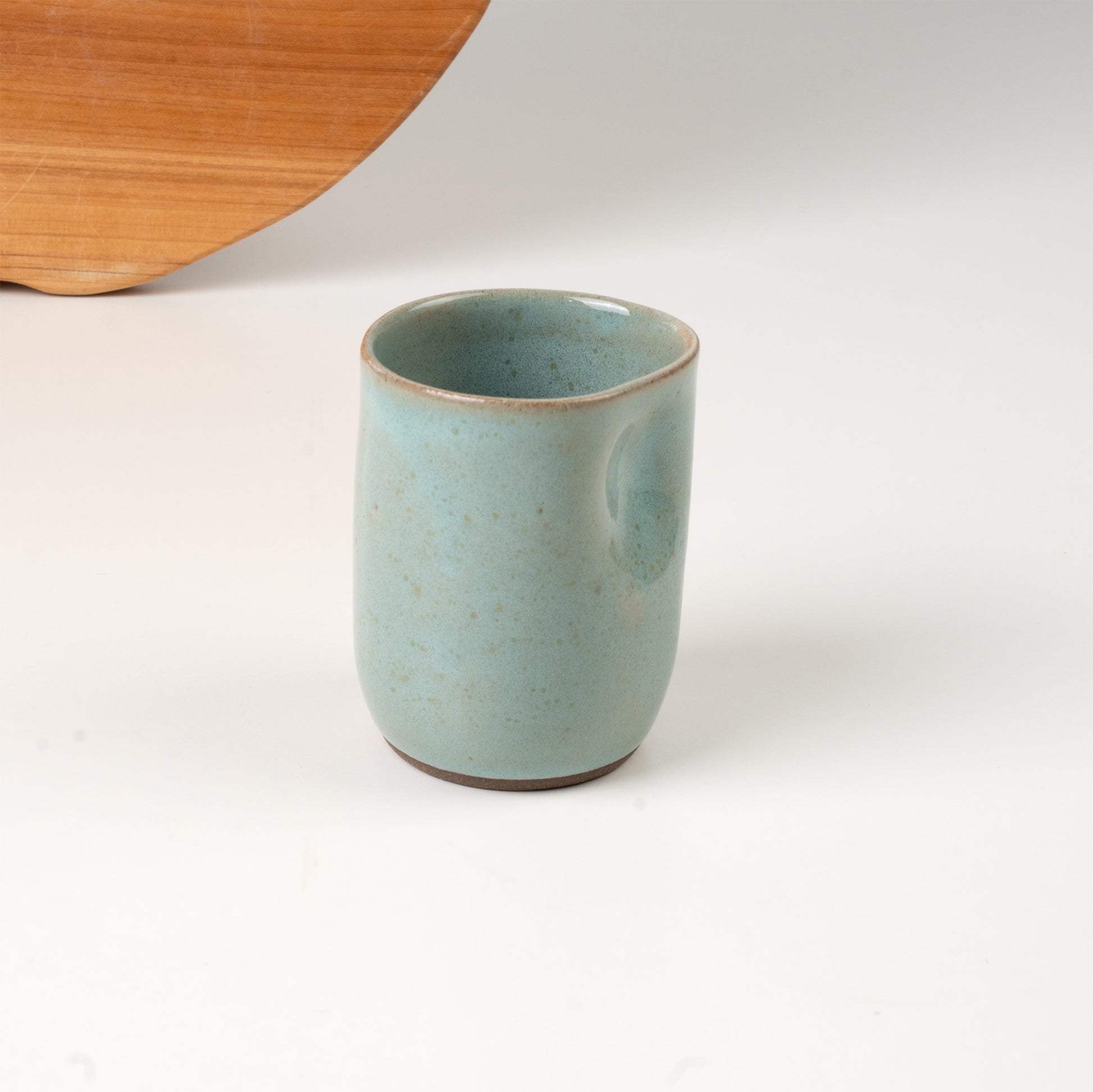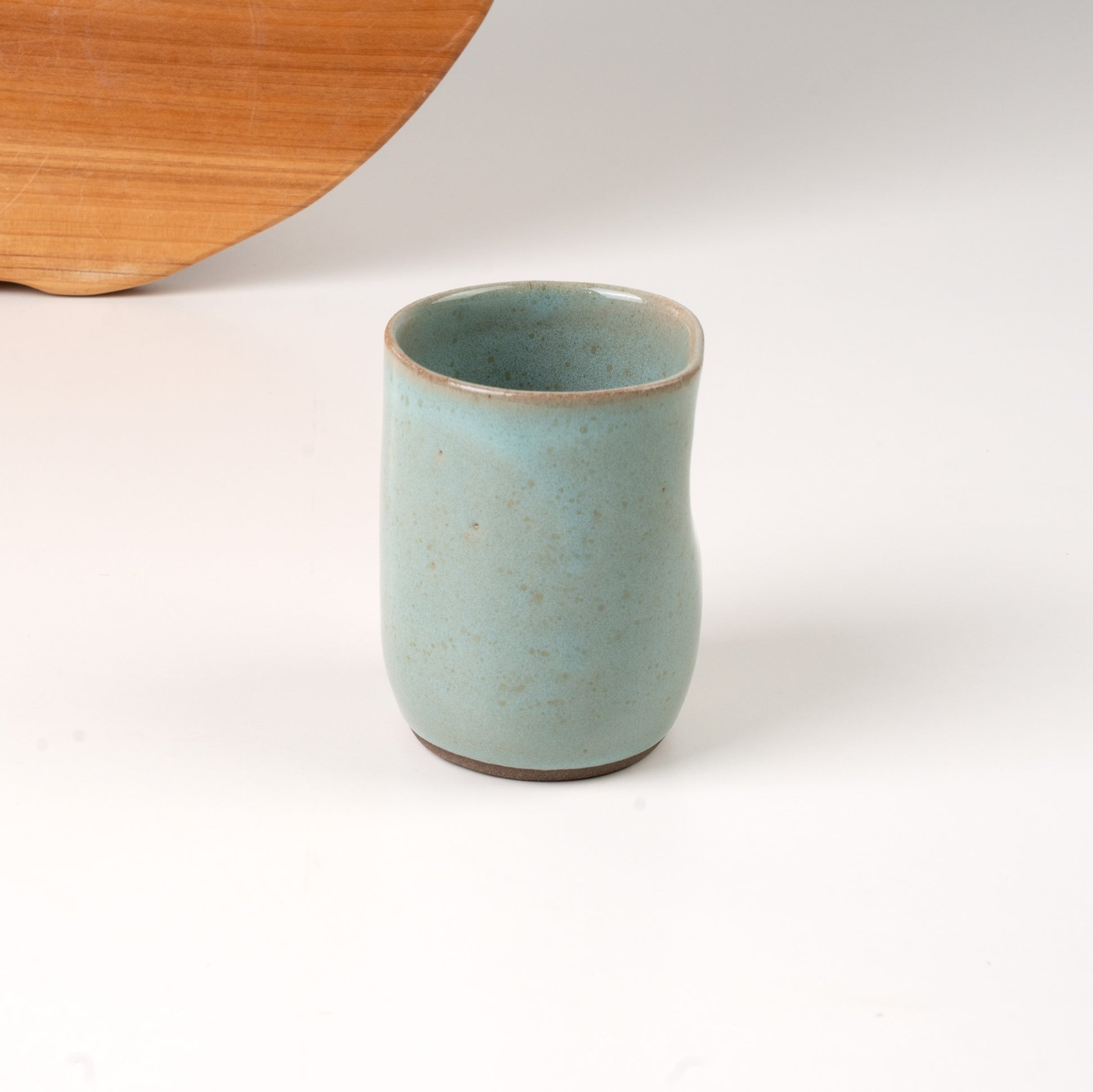Copo Alto Encontro Amassadinho em cerâmica artesanal, com formato cilíndrico e um leve amassado lateral que traz personalidade e conforto ao segurar. Feito à mão, é ideal para servir bebidas como sucos, cafés longos ou água, com autenticidade e presença na mesa.
