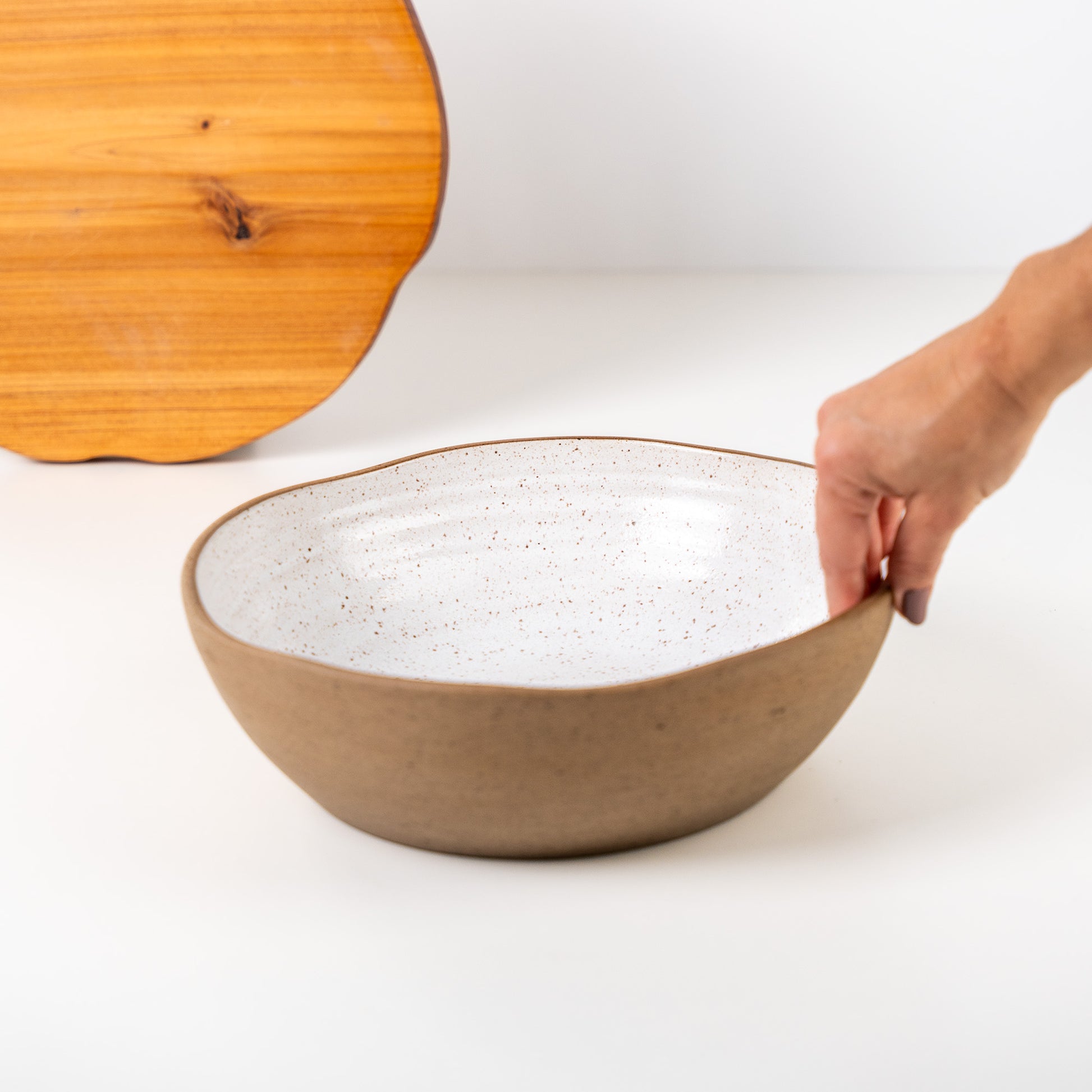 Feito a mão: A matéria-prima ganha forma e identidade através do toque das mãos. Pequenas variações de tamanho, textura e tonalidade fazem parte dessa jornada, tornando cada criação exclusiva. A argila responde ao fogo de maneira singular, criando nuances e efeitos impossíveis de replicar em série.