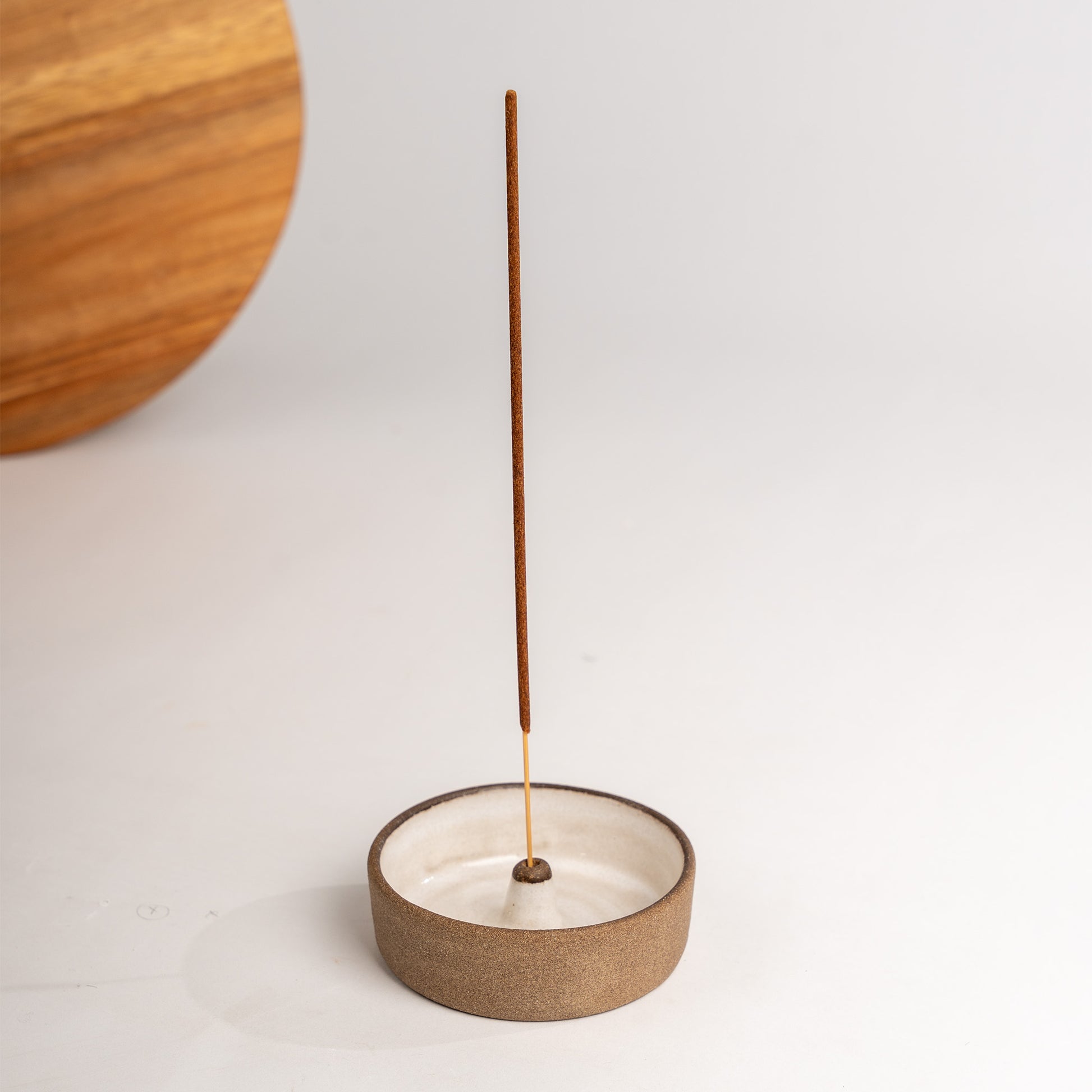 Incensário Redondo em cerâmica artesanal, feito à mão com forma simples e acabamento natural. Seu desenho circular cria um centro equilibrado para queimar incensos de vareta com segurança e estilo. Ideal para compor momentos de pausa, cuidado e rituais pessoais com uma peça funcional e delicadamente feita.
