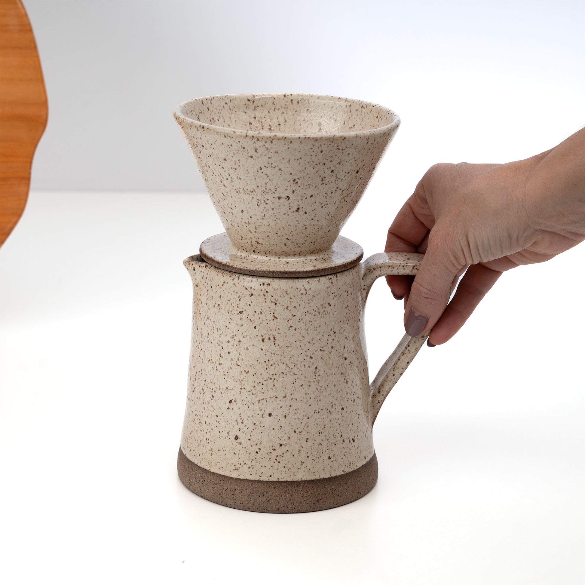 Feita à mão, essa peça une estética funcional com a beleza da cerâmica artesanal. A forma reta da jarra garante estabilidade e fácil manuseio, enquanto o porta filtro acoplado expressa cuidado no design. Perfeita para quem valoriza simplicidade, beleza e autenticidade no dia a dia.