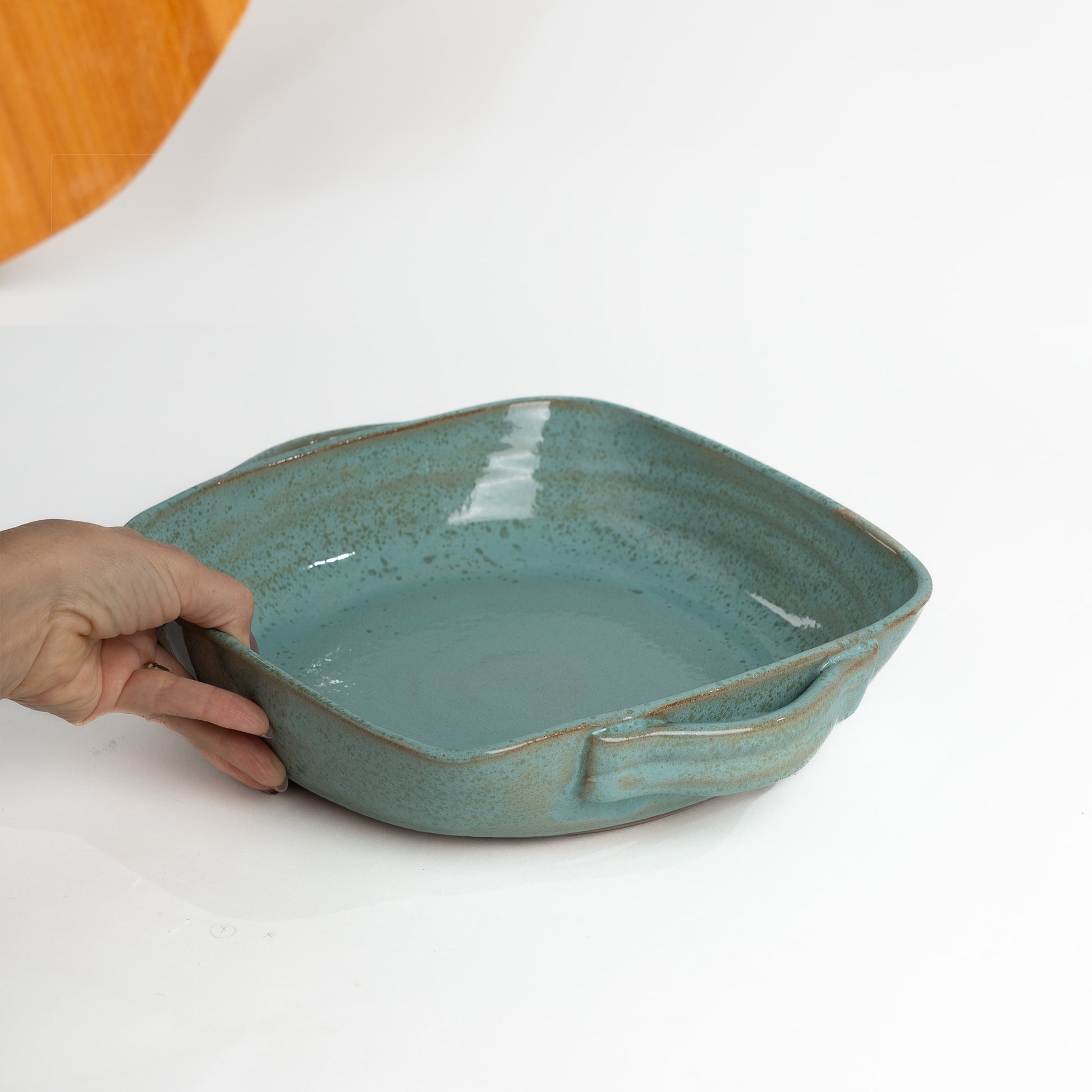 Lasanheira quadrada com alças em cerâmica artesanal, feita à mão com linhas retas, bordas elevadas e alças laterais que facilitam o uso. Ideal para preparar e servir lasanhas, tortas e assados diretamente à mesa, combinando funcionalidade e presença estética. O formato quadrado acomoda bem porções médias e valoriza a apresentação do prato.