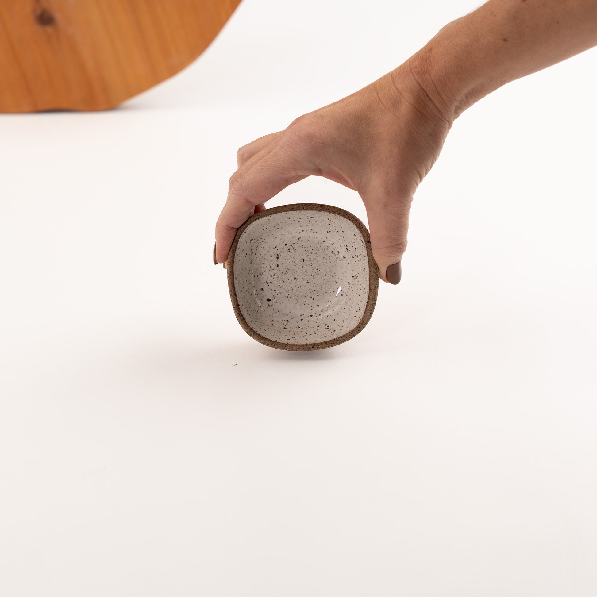 Mini bowl quadrado em cerâmica artesanal, ideal para servir porções pequenas com charme e delicadeza. Seu formato geométrico e acabamento feito à mão conferem personalidade à peça, perfeita para entradas, acompanhamentos, molhos ou petiscos.
