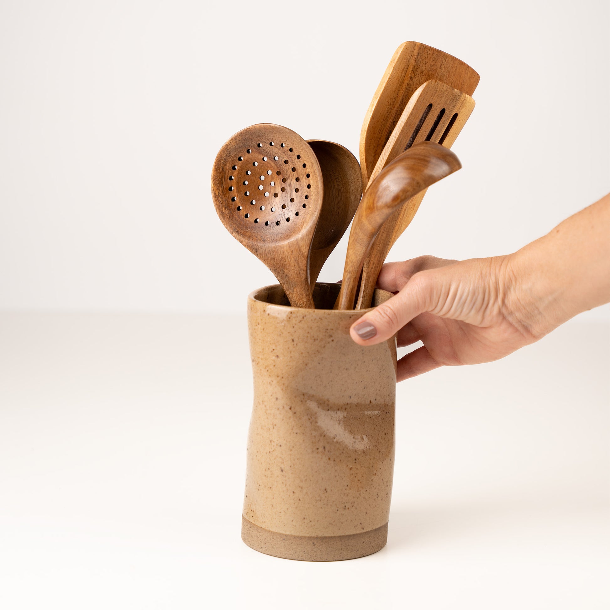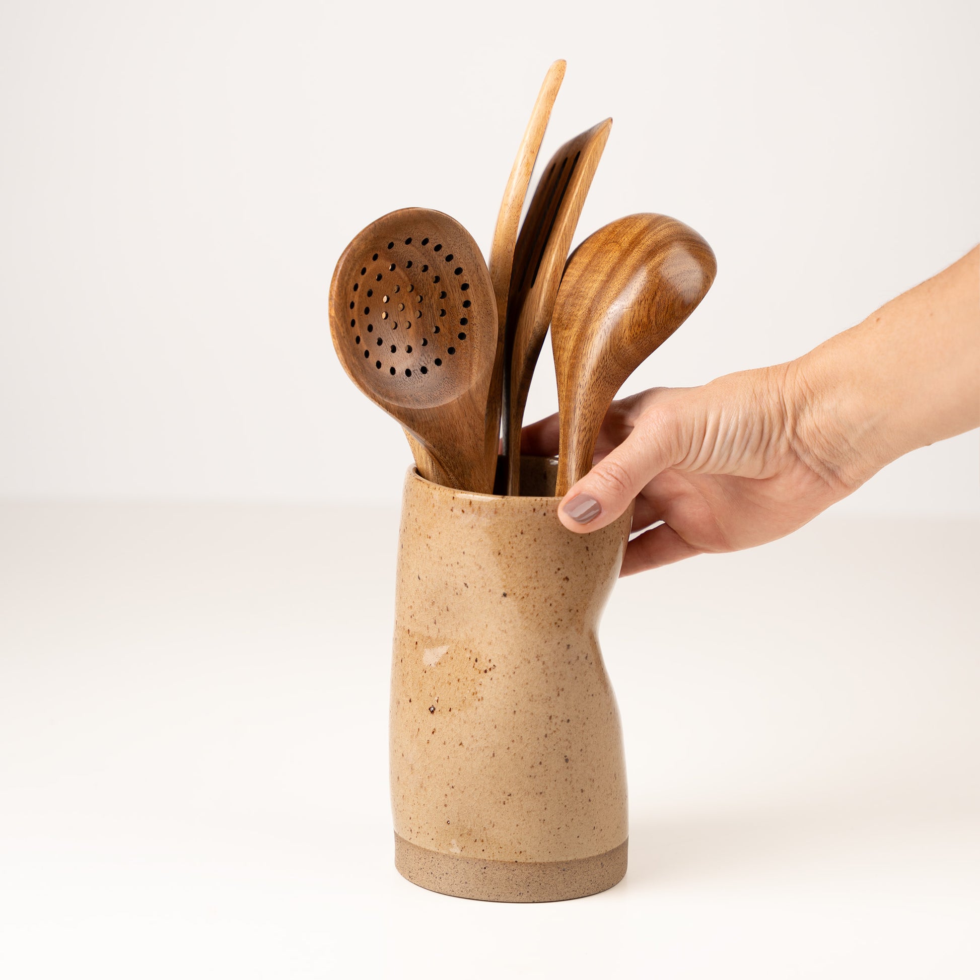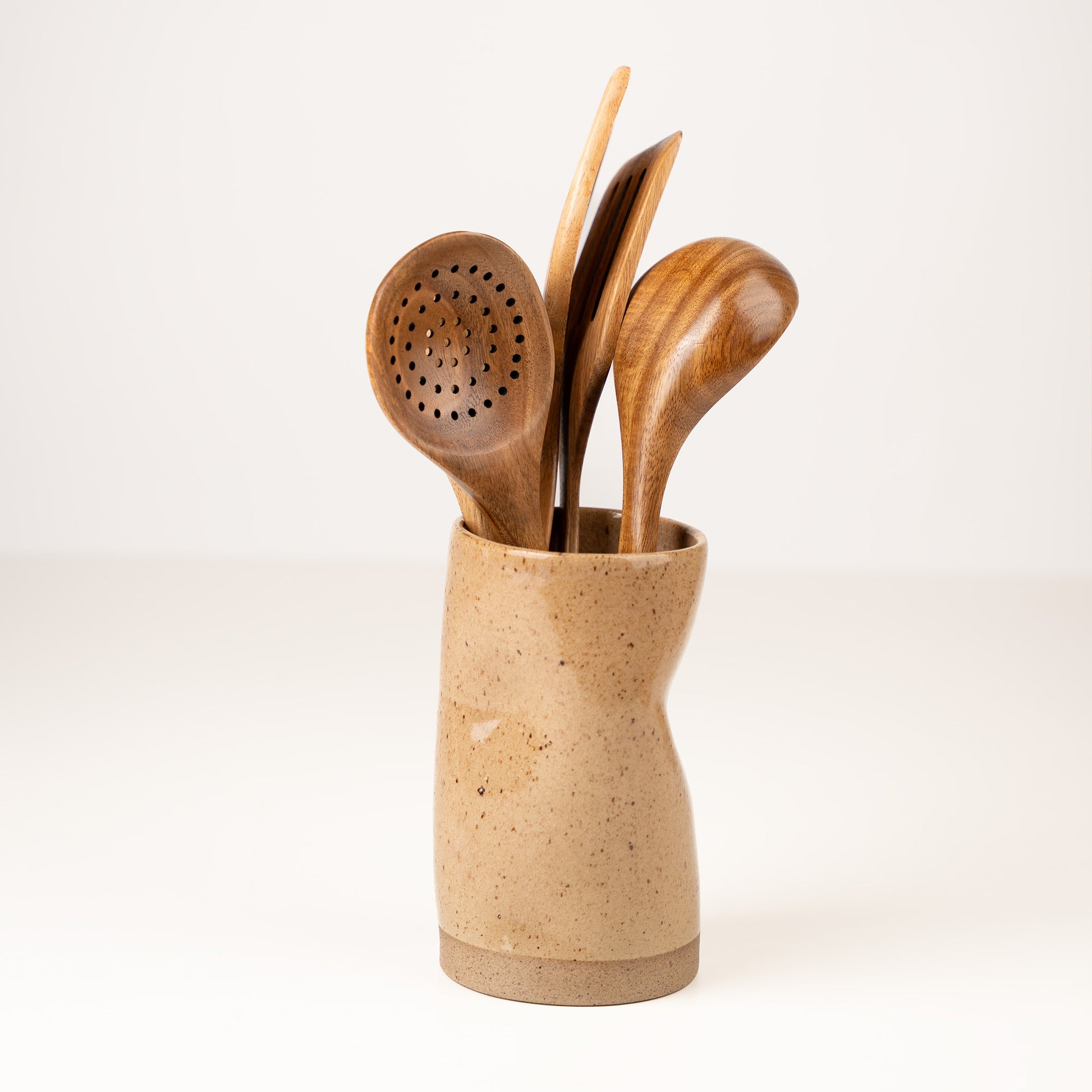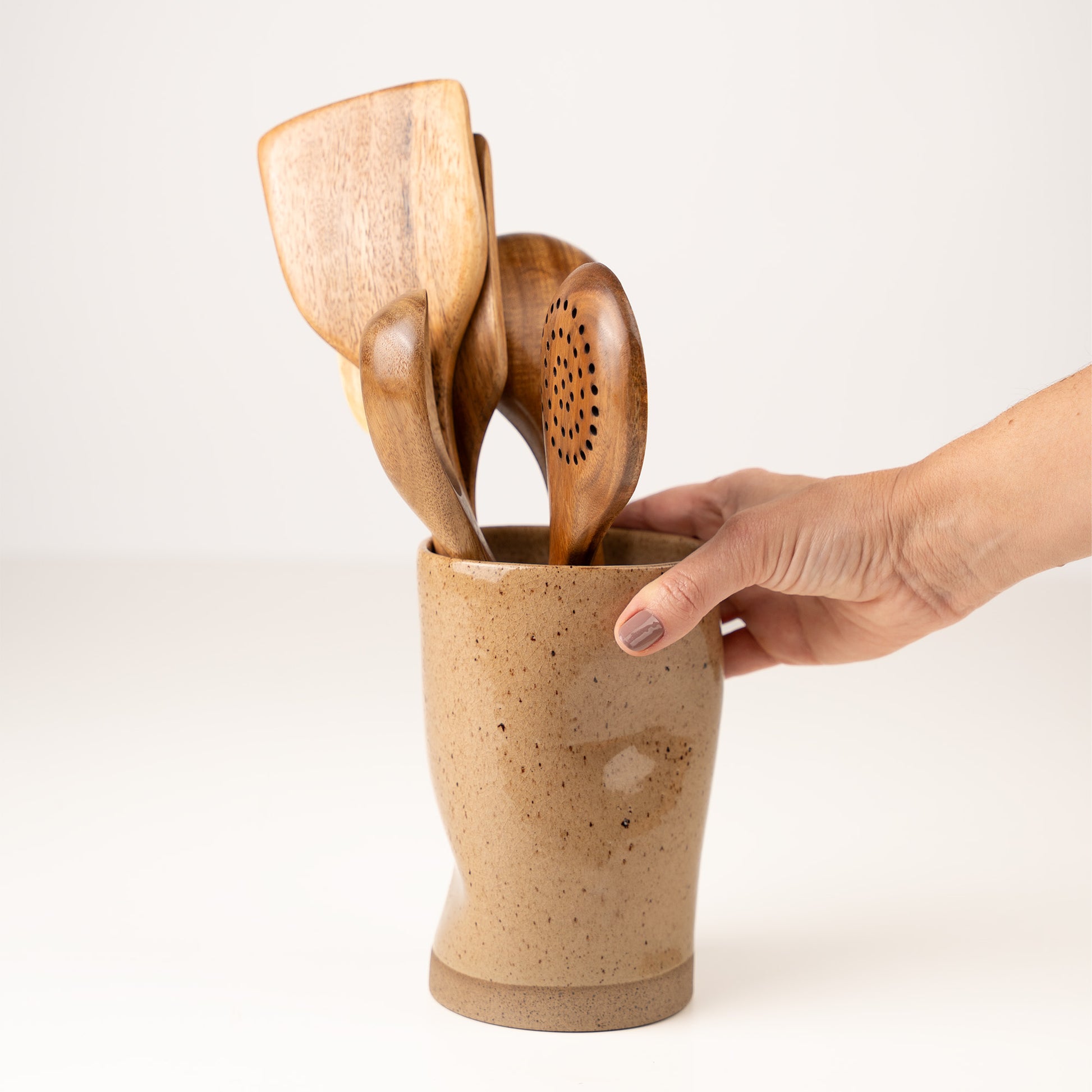 Produzido à mão em cerâmica artesanal, cada porta utensílios possui variações únicas que ressaltam o caráter exclusivo da peça. O estilo orgânico valoriza formas suaves e irregulares, criando uma presença acolhedora e sofisticada, perfeita para cozinhas modernas ou rústicas.