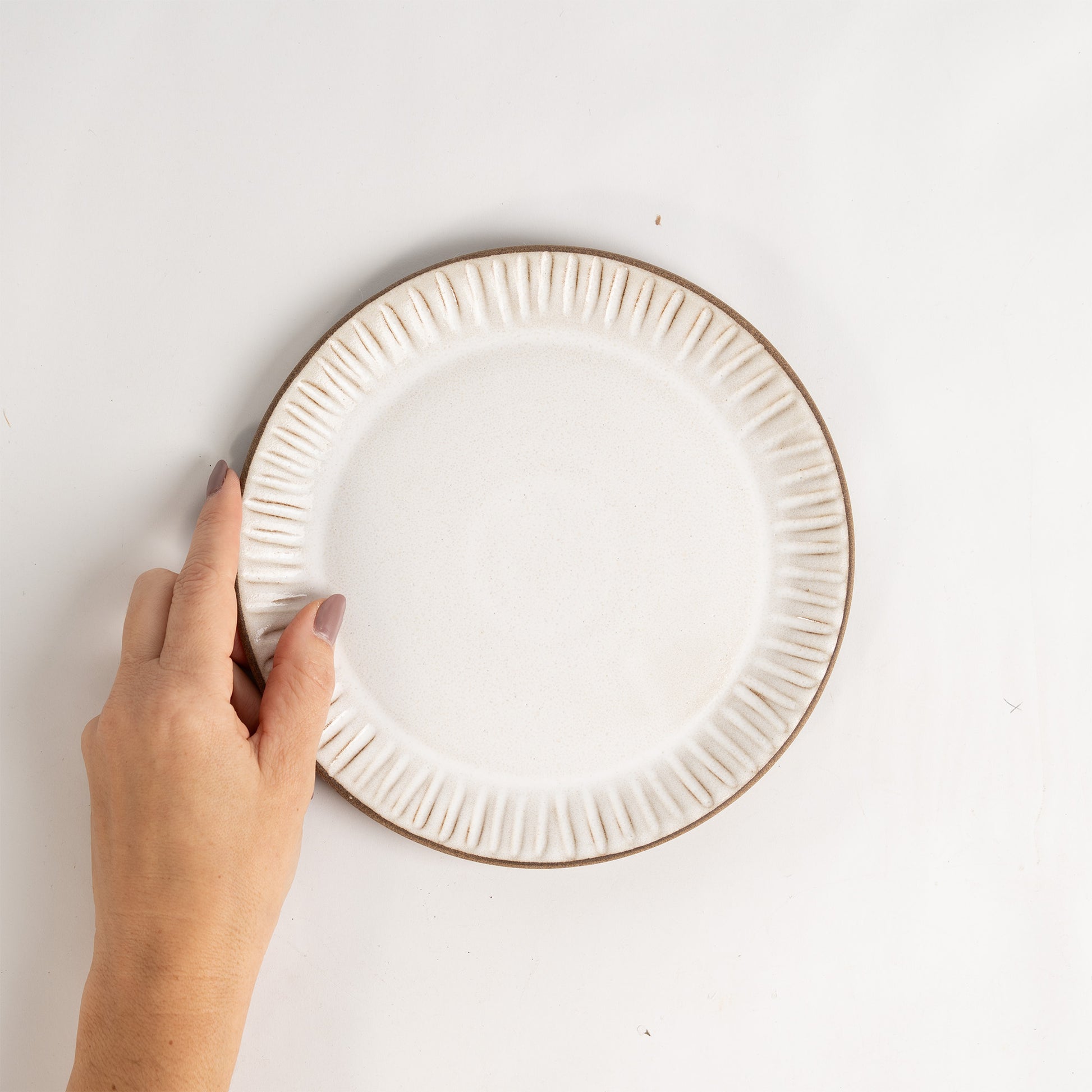 DescriçãoPrato Carving Sobremesa em cerâmica artesanal, feito à mão com acabamento texturizado que valoriza o gesto e o detalhe. A superfície esculpida em baixo relevo confere personalidade à peça e destaca qualquer sobremesa com elegância e originalidade. Ideal para servir doces, frutas ou pequenas entradas com um toque autoral. Disponível em diferentes cores e massas, é uma peça que combina estética e funcionalidade, perfeita para composições criativas à mesa. Feito a mão: A matéria-prima ganha forma e identidade através do toque das mãos. Pequenas variações de tamanho, textura e tonalidade fazem parte dessa jornada, tornando cada criação exclusiva. A argila responde ao fogo de maneira singular, criando nuances e efeitos impossíveis de replicar em série.