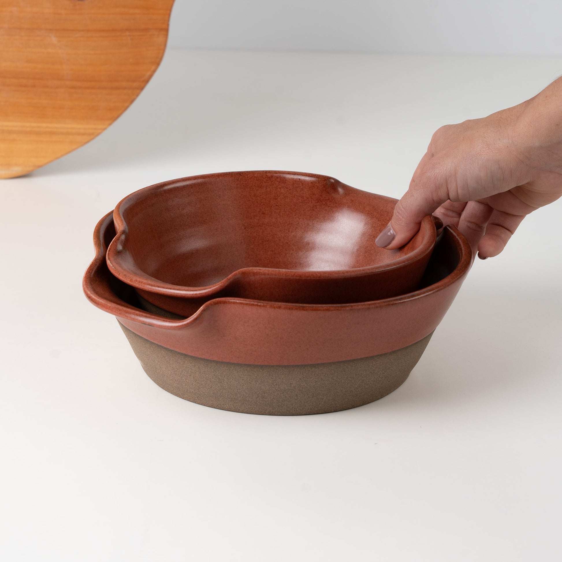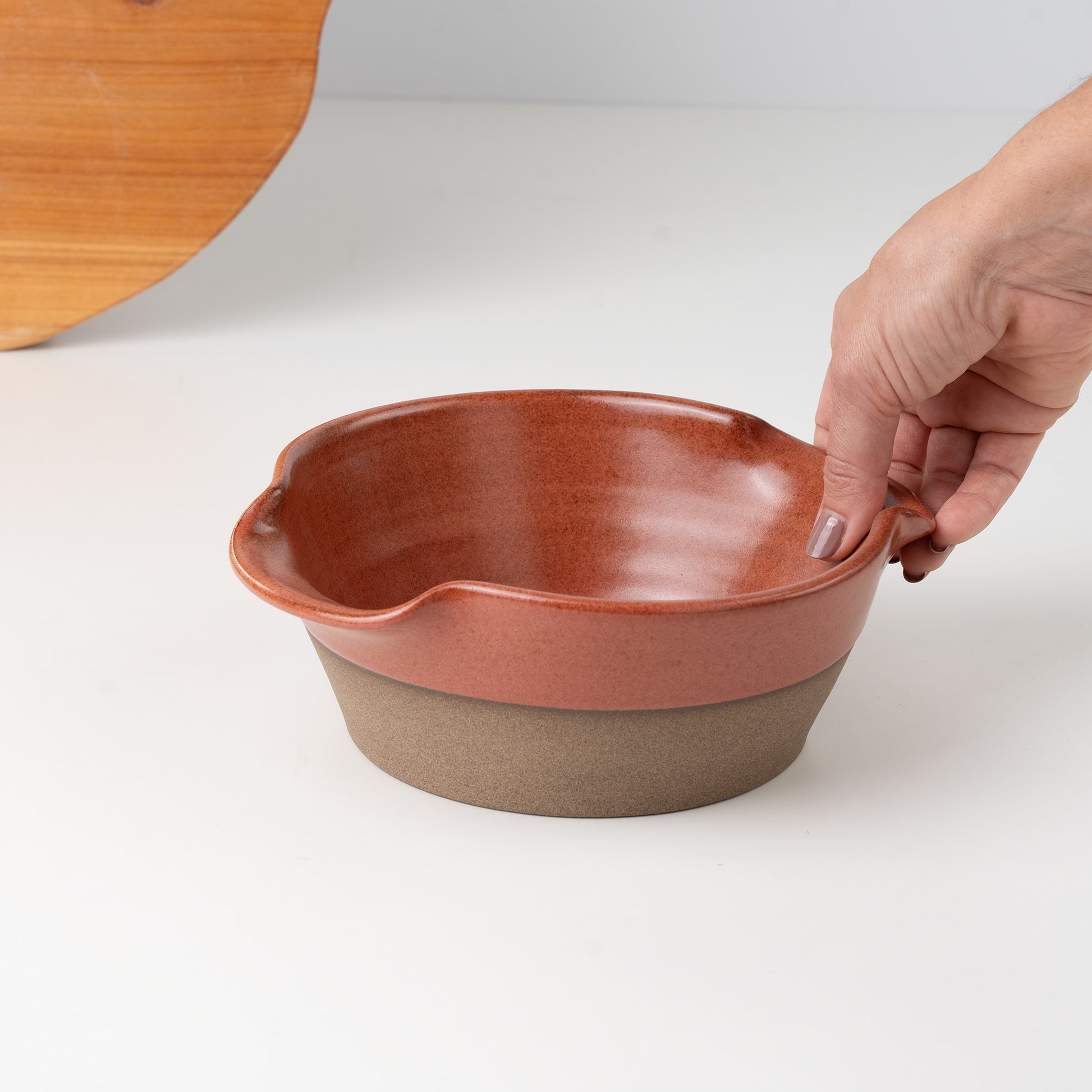 Saladeira com alças no corpo em cerâmica artesanal, feita à mão com acabamento suave e alças discretamente moldadas no próprio corpo da peça. Ideal para servir saladas, massas ou receitas compartilhadas, une funcionalidade e beleza com o charme do feito à mão.