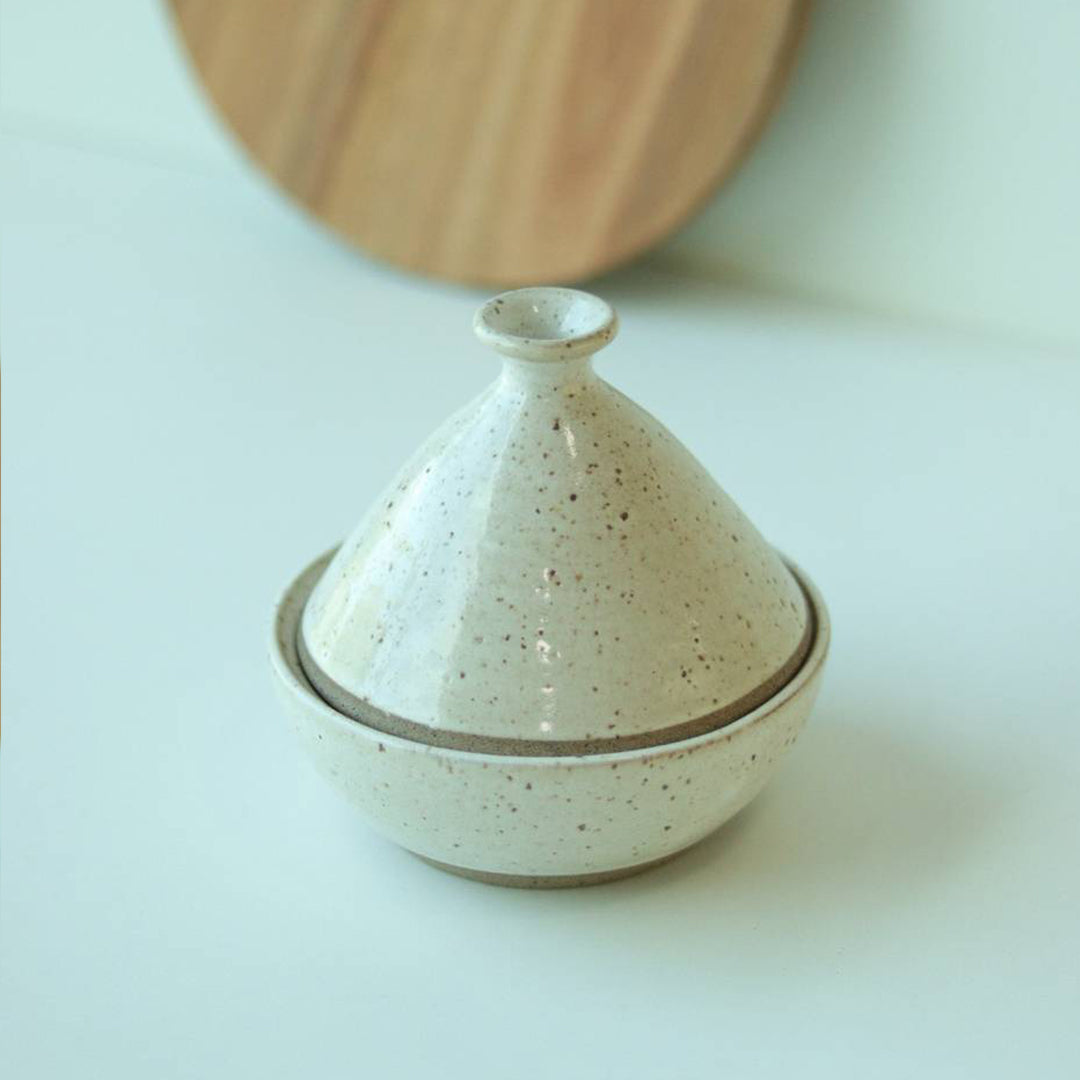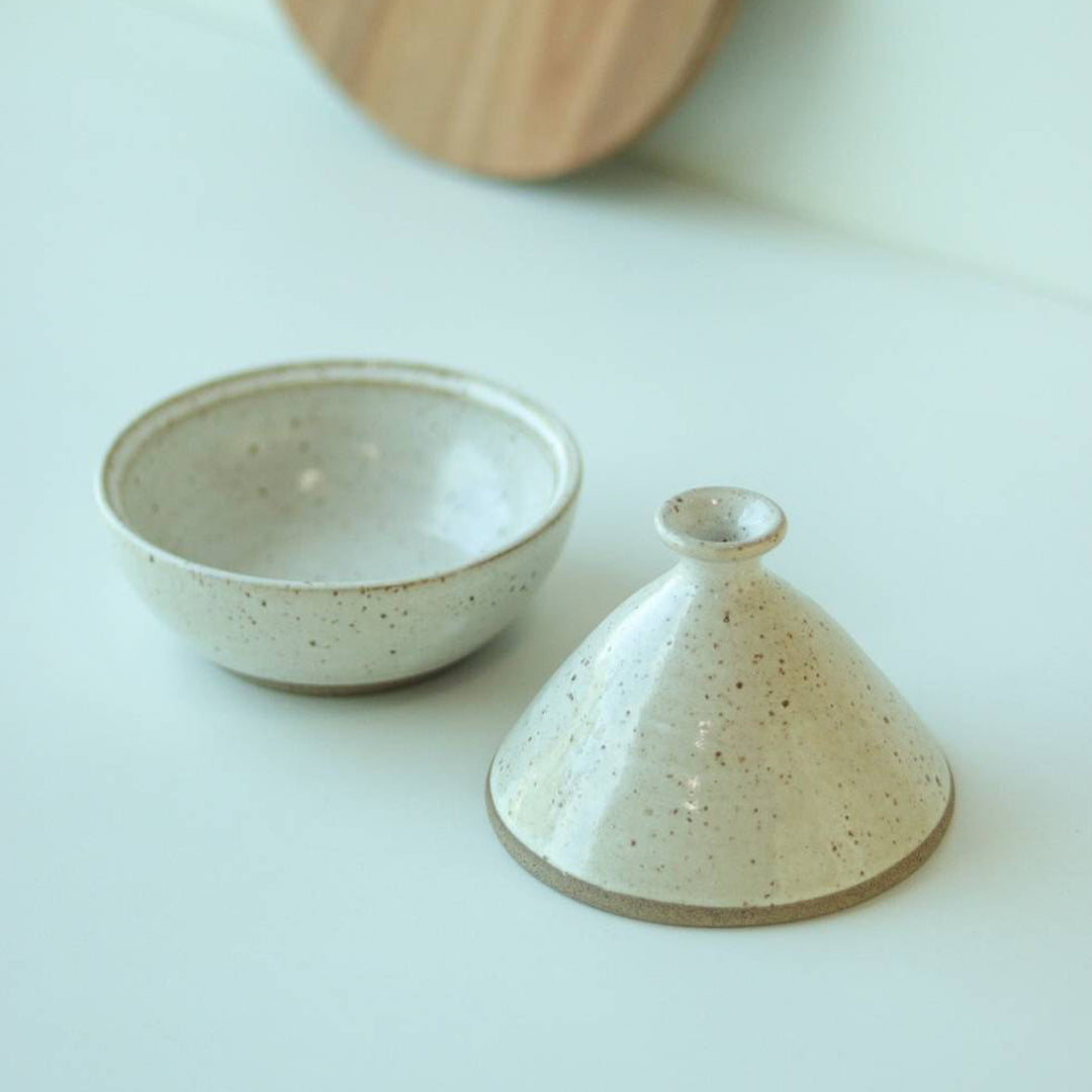 Saleiro Marroquino em cerâmica artesanal, inspirado nas formas e na tradição das peças do norte da África. Com tampa e abertura funcional, esse saleiro é ideal para conservar o sal com charme e proteger o conteúdo do ambiente.