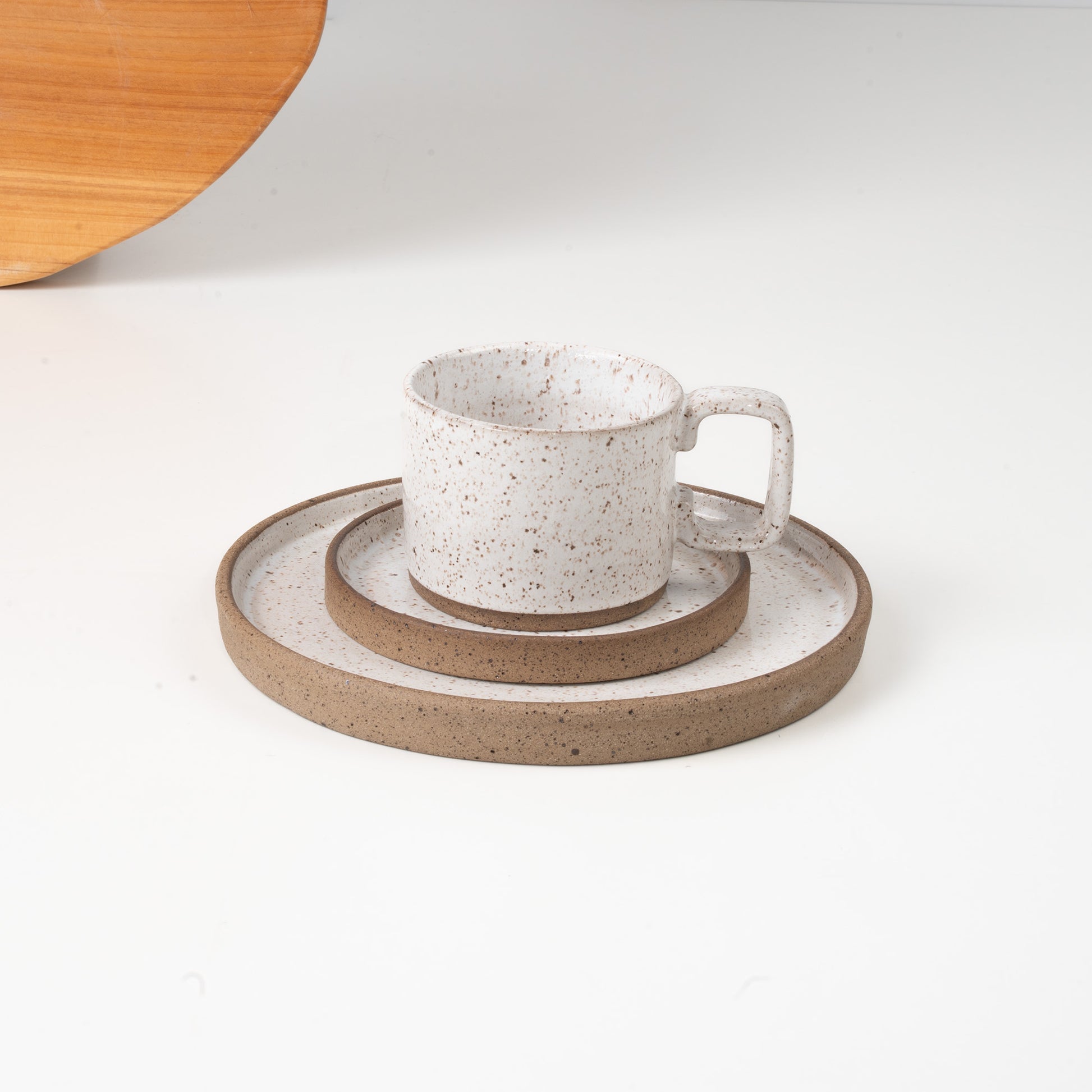 DescriçãoSET Café da Manhã Reta Com formas limpas e modernas, o Set Café da Manhã Reta é ideal para quem gosta de começar o dia com elegância e funcionalidade. A combinação da xícara, pires e prato de sobremesa com bordas retas traz um visual contemporâneo à mesa, sem abrir mão do afeto do artesanal. Feito à mão em cerâmica, cada peça carrega a beleza da simplicidade e o cuidado nos detalhes. Perfeito para cafés da manhã completos, brunchs ou momentos de pausa no meio do dia, esse conjunto une estilo e praticidade em cada uso. Feito a mão: A matéria-prima ganha forma e identidade através do toque das mãos. Pequenas variações de tamanho, textura e tonalidade fazem parte dessa jornada, tornando cada criação exclusiva. A argila responde ao fogo de maneira singular, criando nuances e efeitos impossíveis de replicar em série.