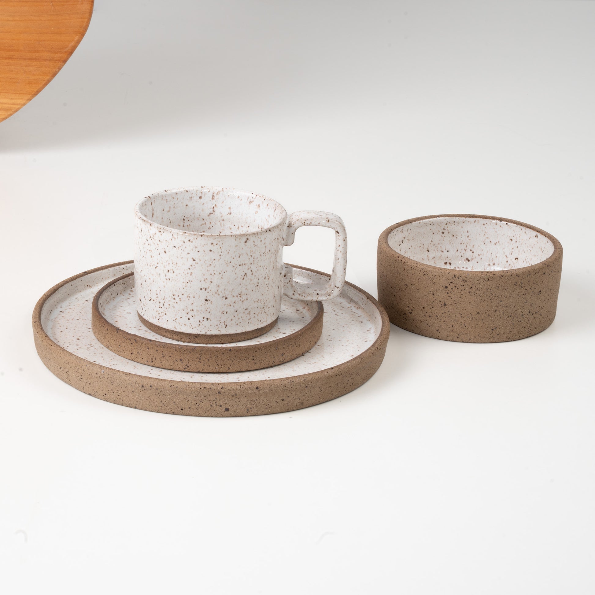 DescriçãoSET Café da Manhã Reta com Bowl O Set Café da Manhã Reta com Bowl traz uma composição completa e funcional, com visual moderno e formas limpas. Ideal para quem valoriza um café da manhã bem servido, ele combina xícara, pires, prato e bowl em cerâmica artesanal com bordas retas e acabamento elegante. Feito a mão: A matéria-prima ganha forma e identidade através do toque das mãos. Pequenas variações de tamanho, textura e tonalidade fazem parte dessa jornada, tornando cada criação exclusiva. A argila responde ao fogo de maneira singular, criando nuances e efeitos impossíveis de replicar em série.