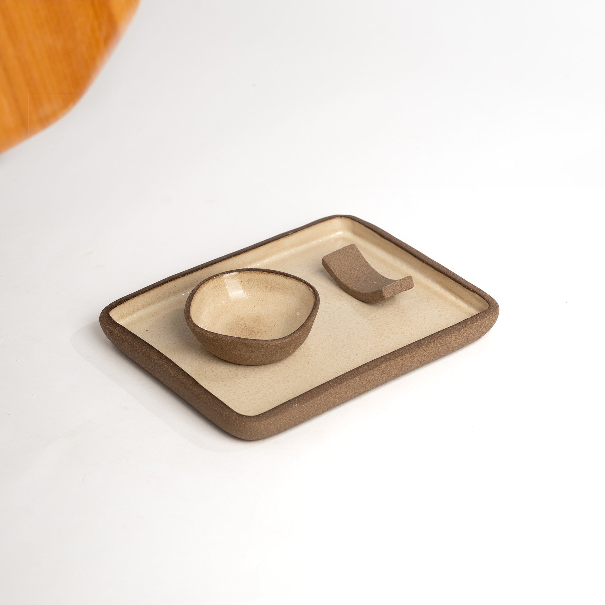 Set com pratinho retangular de borda reta, nosoki e descanso de hashi em arco, em cerâmica artesanal feita à mão. Ideal para quem aprecia experiências à mesa com estética japonesa e funcionalidade, o pratinho serve como base para porções, entradas ou peças de sushi. O nosoki acomoda molhos ou acompanhamentos, enquanto o descanso de hashi em arco completa o conjunto com elegância.
