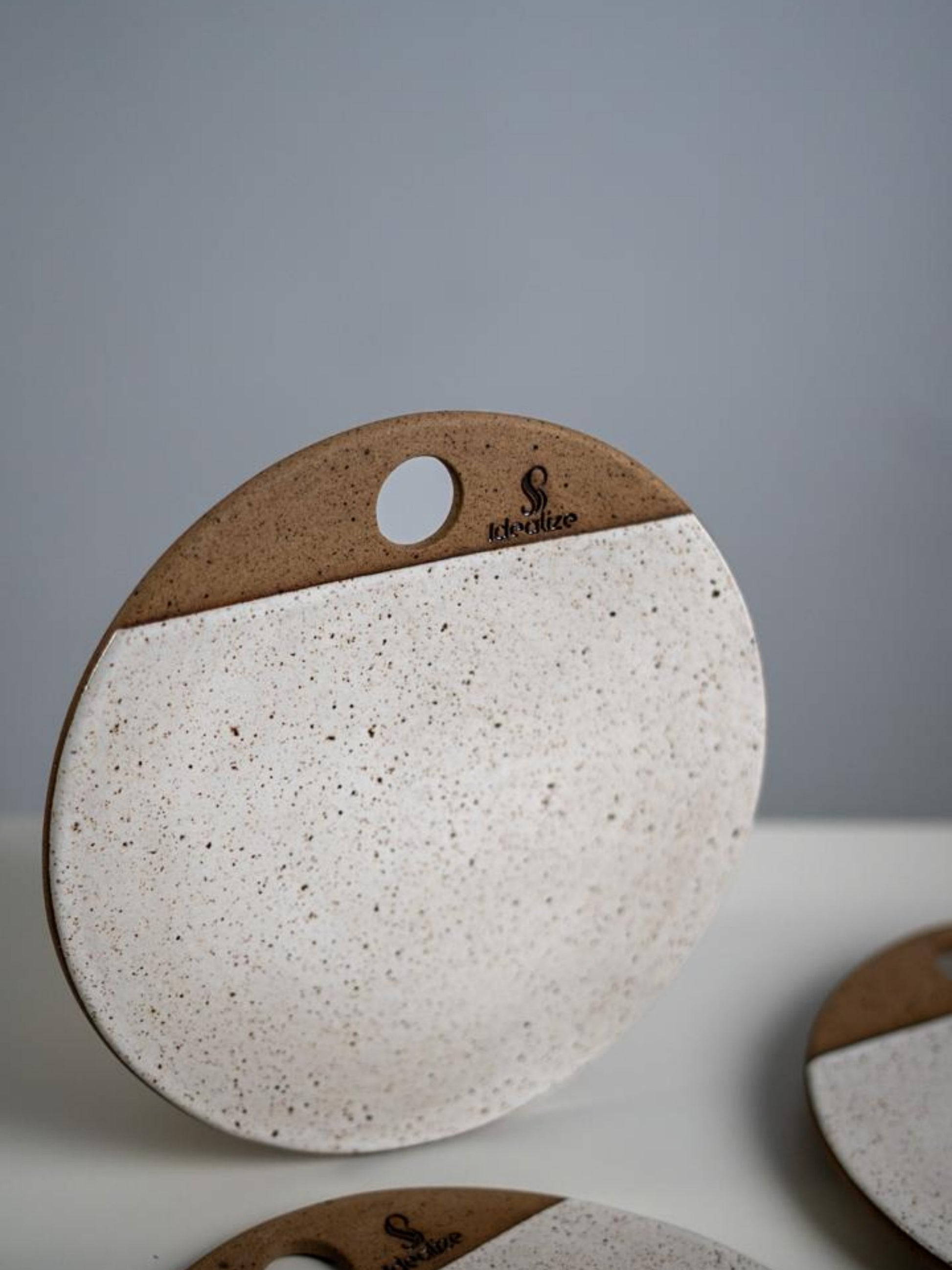 DescriçãoTábua de frios redonda em cerâmica artesanal personalizada, feita à mão com acabamento suave e formato que valoriza a apresentação de queijos, frutas e petiscos. A peça une funcionalidade e beleza, sendo ideal para composições afetivas, celebrações e momentos especiais à mesa. Disponível em diferentes cores e massas, é uma alternativa elegante às tábuas tradicionais, trazendo a força do feito à mão para o centro da mesa posta. Feito a mão: A matéria-prima ganha forma e identidade através do toque das mãos. Pequenas variações de tamanho, textura e tonalidade fazem parte dessa jornada, tornando cada criação exclusiva. A argila responde ao fogo de maneira singular, criando nuances e efeitos impossíveis de replicar em série.