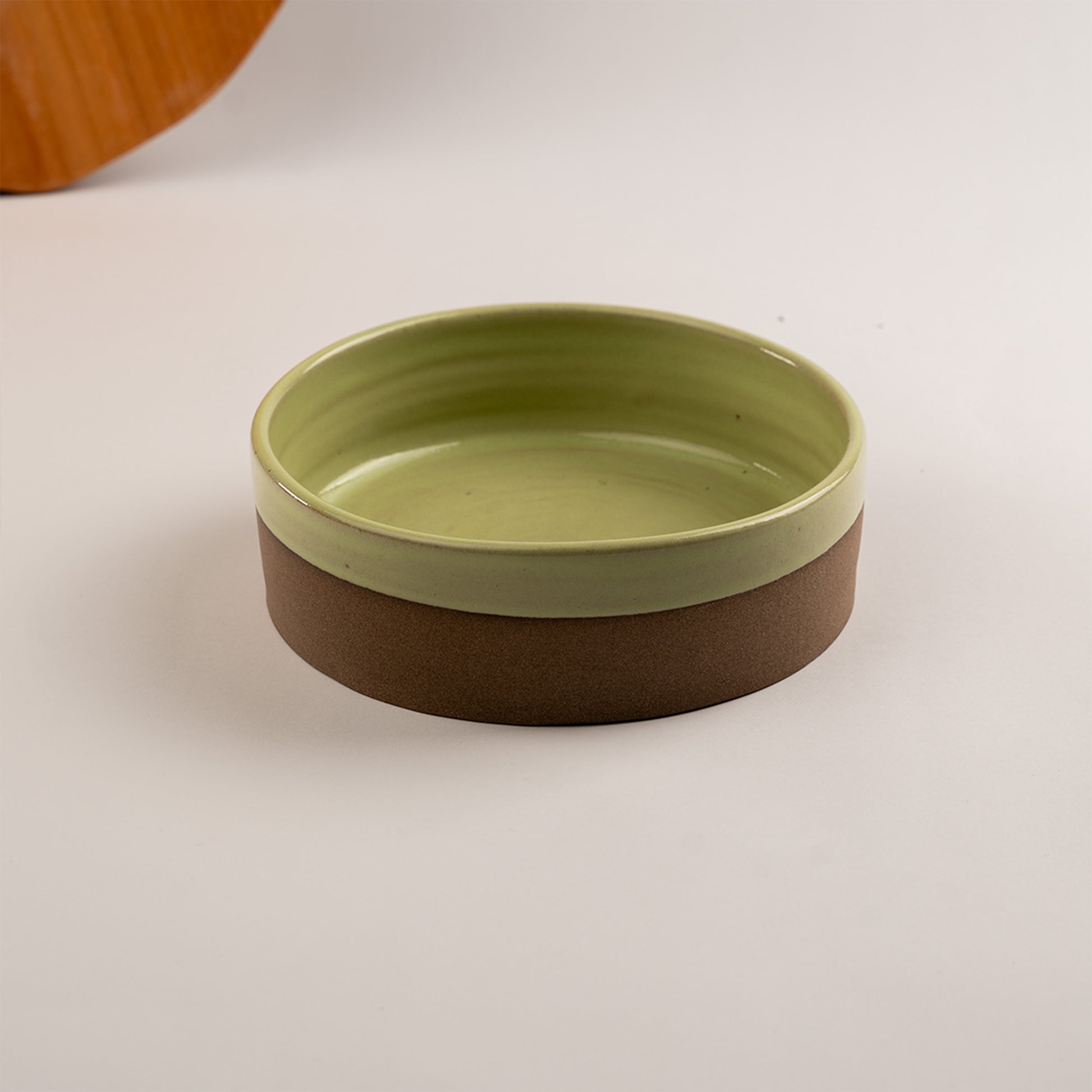 Travessa Redonda com borda reta em cerâmica artesanal, feita à mão com acabamento que deixa o esmalte aparente apenas até o meio externo da peça. Esse detalhe evidencia a textura natural da argila e cria contraste entre matéria crua e brilho do esmalte, valorizando o gesto manual e a estética rústico-elegante. Ideal para servir porções, saladas ou composições de centro de mesa com presença e personalidade.