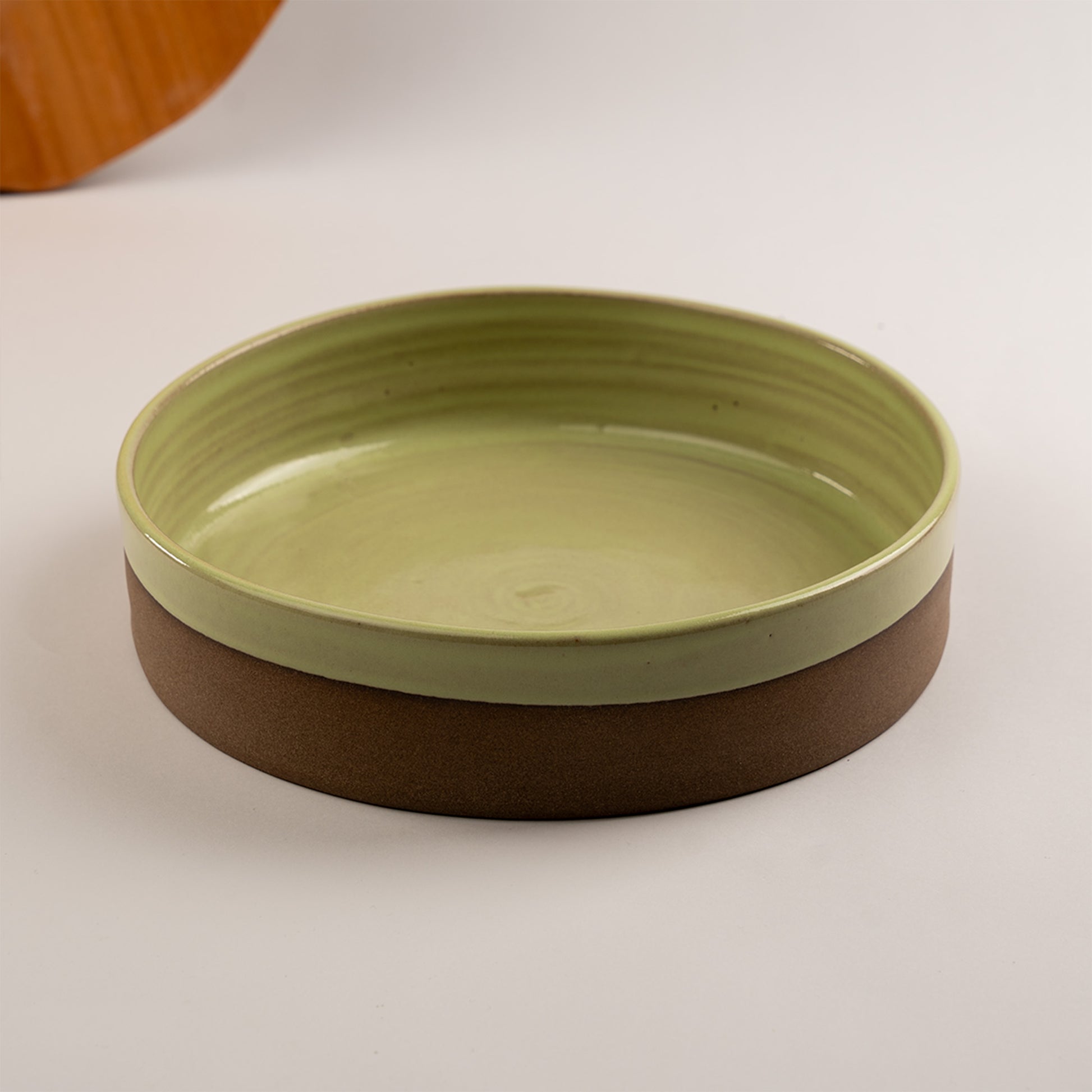 Travessa Redonda com borda reta em cerâmica artesanal, feita à mão com acabamento que deixa o esmalte aparente apenas até o meio externo da peça. Esse detalhe evidencia a textura natural da argila e cria contraste entre matéria crua e brilho do esmalte, valorizando o gesto manual e a estética rústico-elegante. Ideal para servir porções, saladas ou composições de centro de mesa com presença e personalidade.