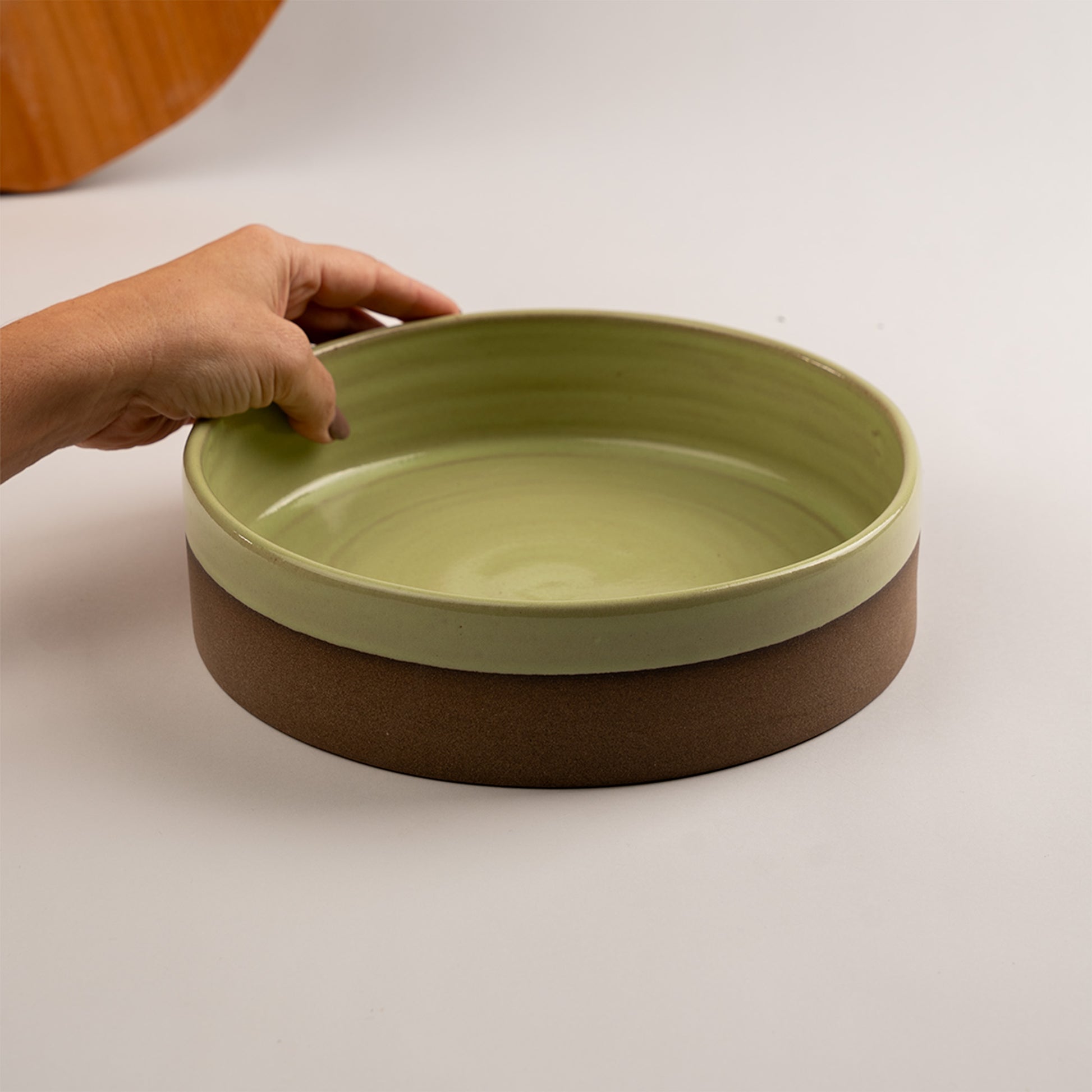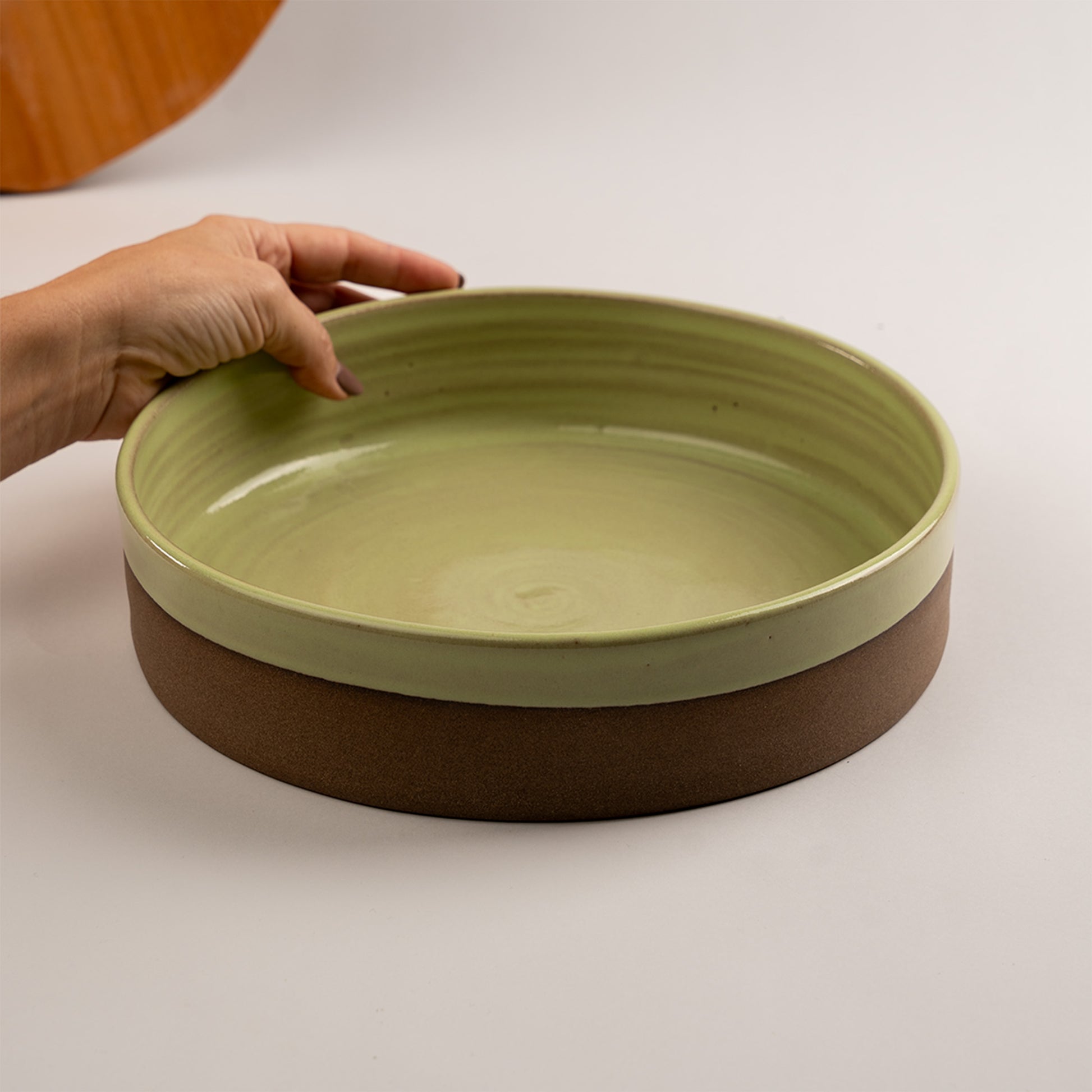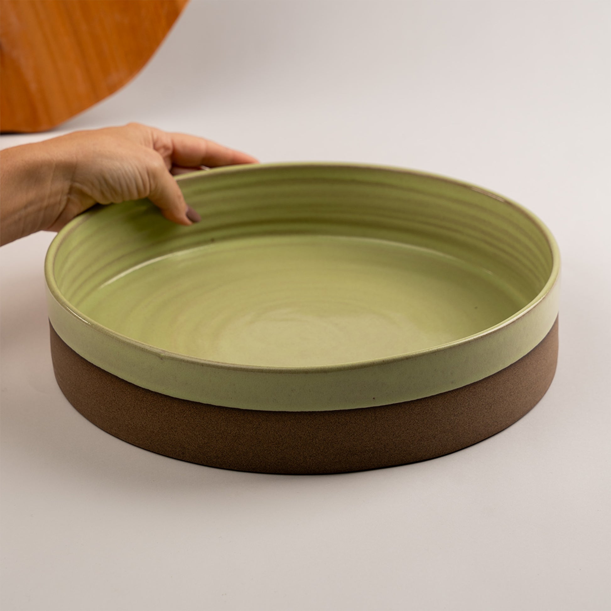 Travessa Redonda com borda reta em cerâmica artesanal, feita à mão com acabamento que deixa o esmalte aparente apenas até o meio externo da peça. Esse detalhe evidencia a textura natural da argila e cria contraste entre matéria crua e brilho do esmalte, valorizando o gesto manual e a estética rústico-elegante. Ideal para servir porções, saladas ou composições de centro de mesa com presença e personalidade.
