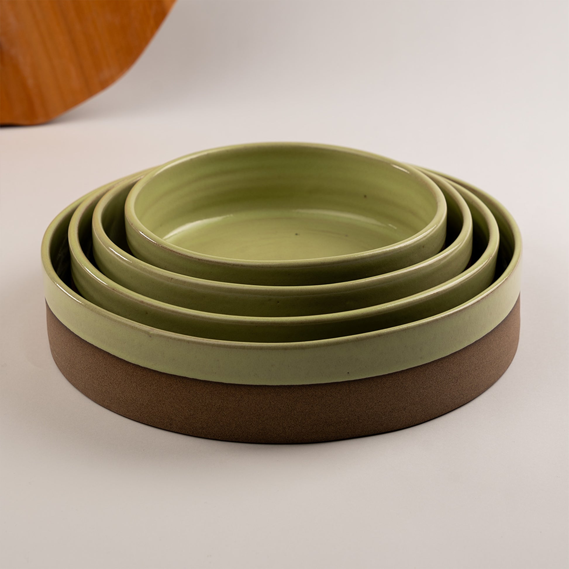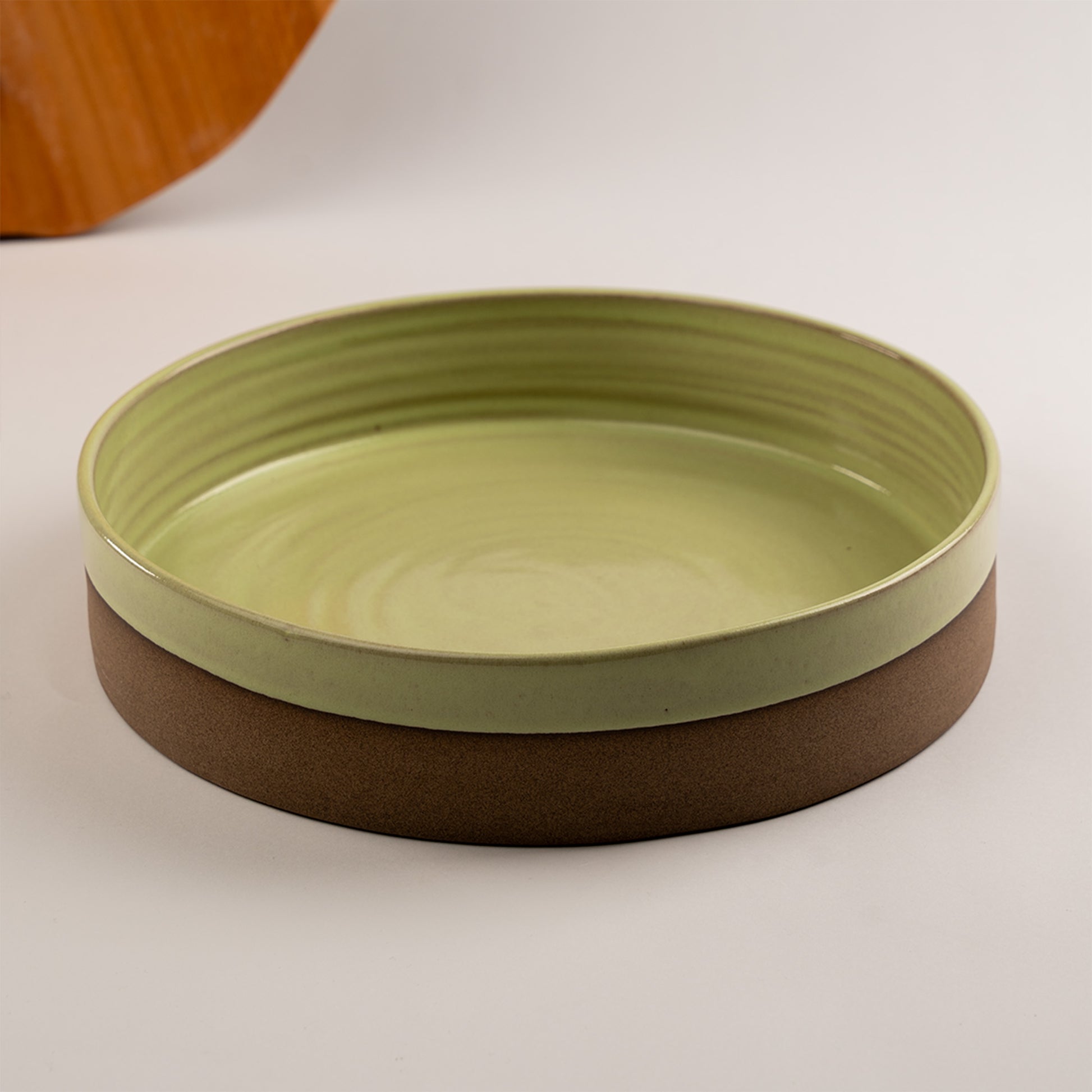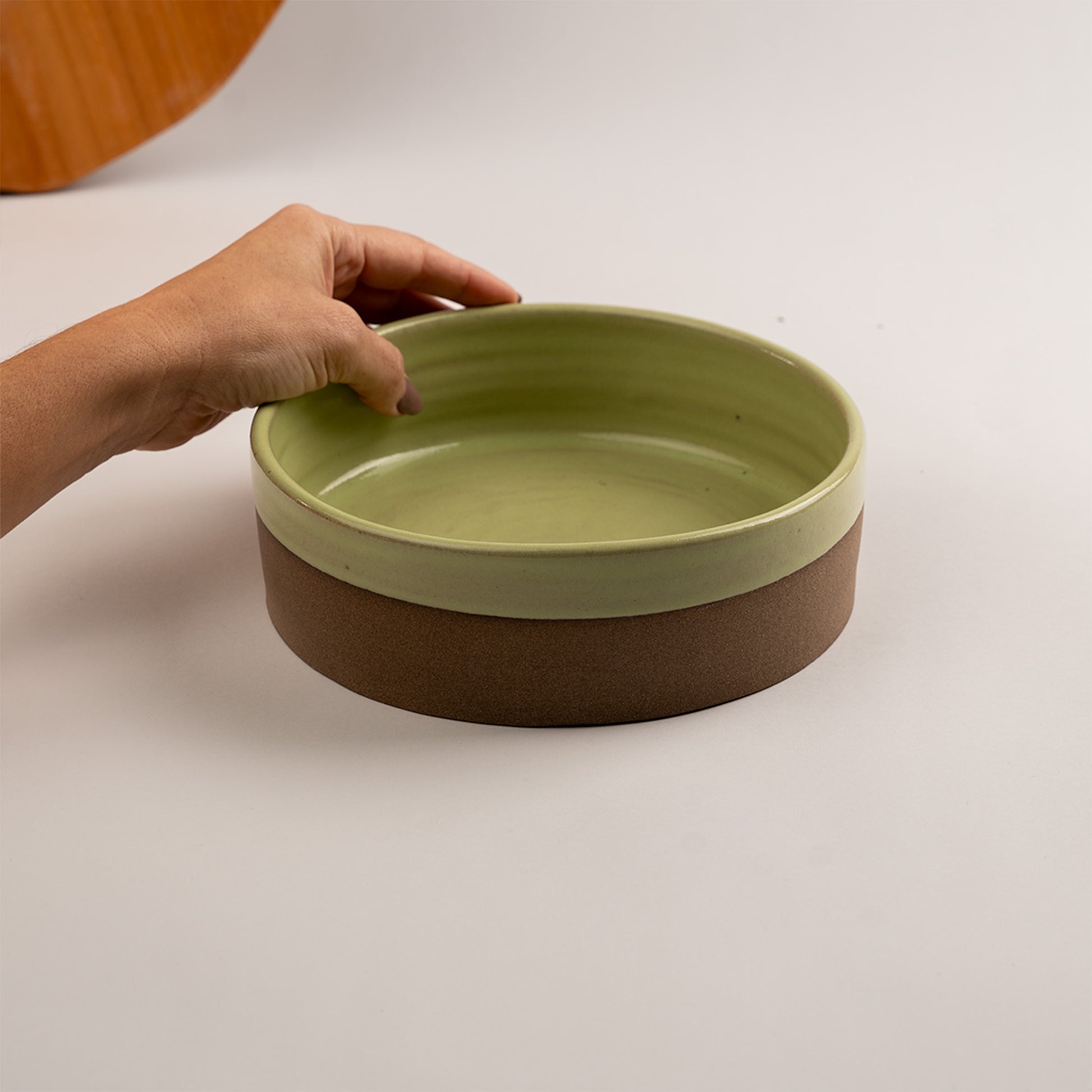 Travessa Redonda com borda reta em cerâmica artesanal, feita à mão com acabamento que deixa o esmalte aparente apenas até o meio externo da peça. Esse detalhe evidencia a textura natural da argila e cria contraste entre matéria crua e brilho do esmalte, valorizando o gesto manual e a estética rústico-elegante. Ideal para servir porções, saladas ou composições de centro de mesa com presença e personalidade.