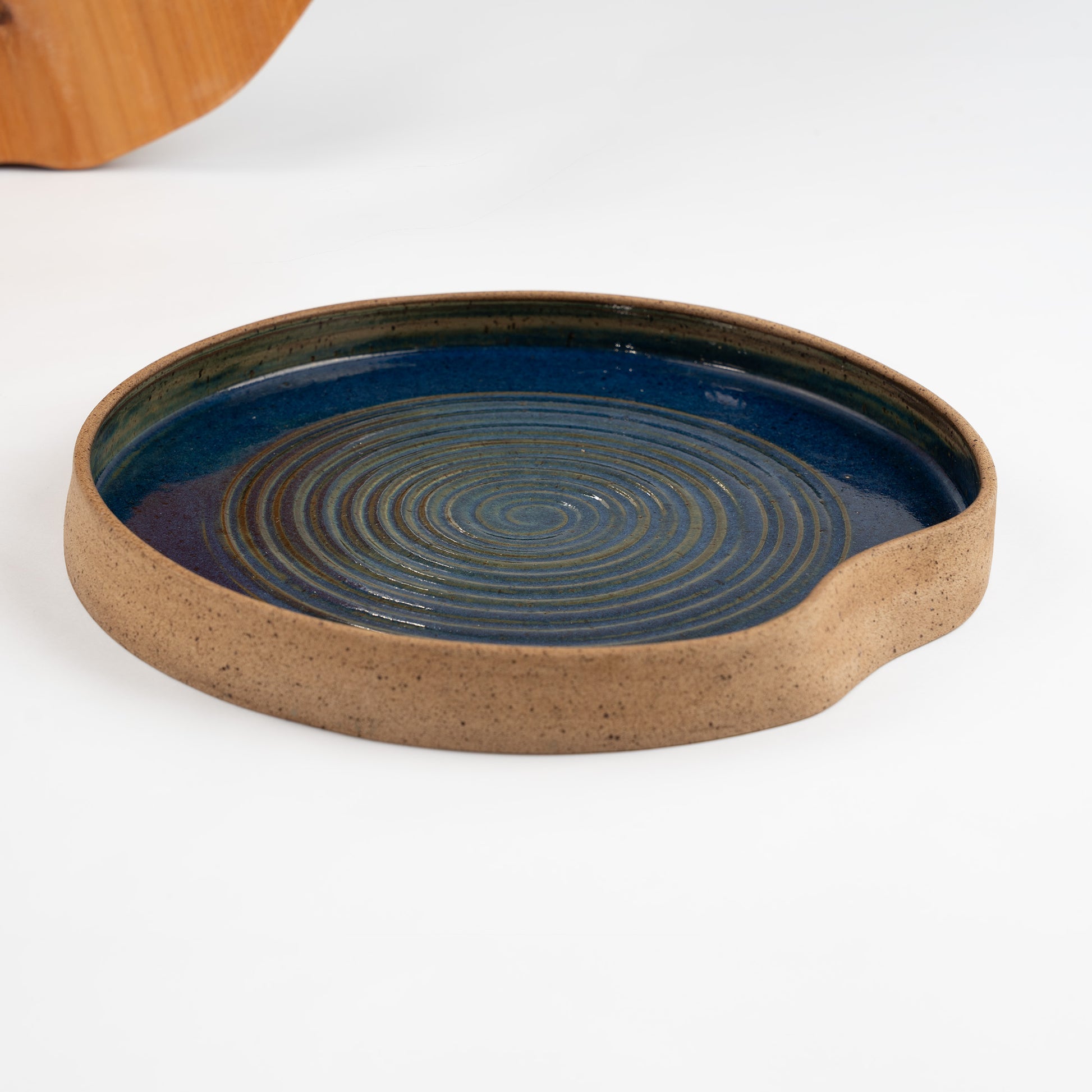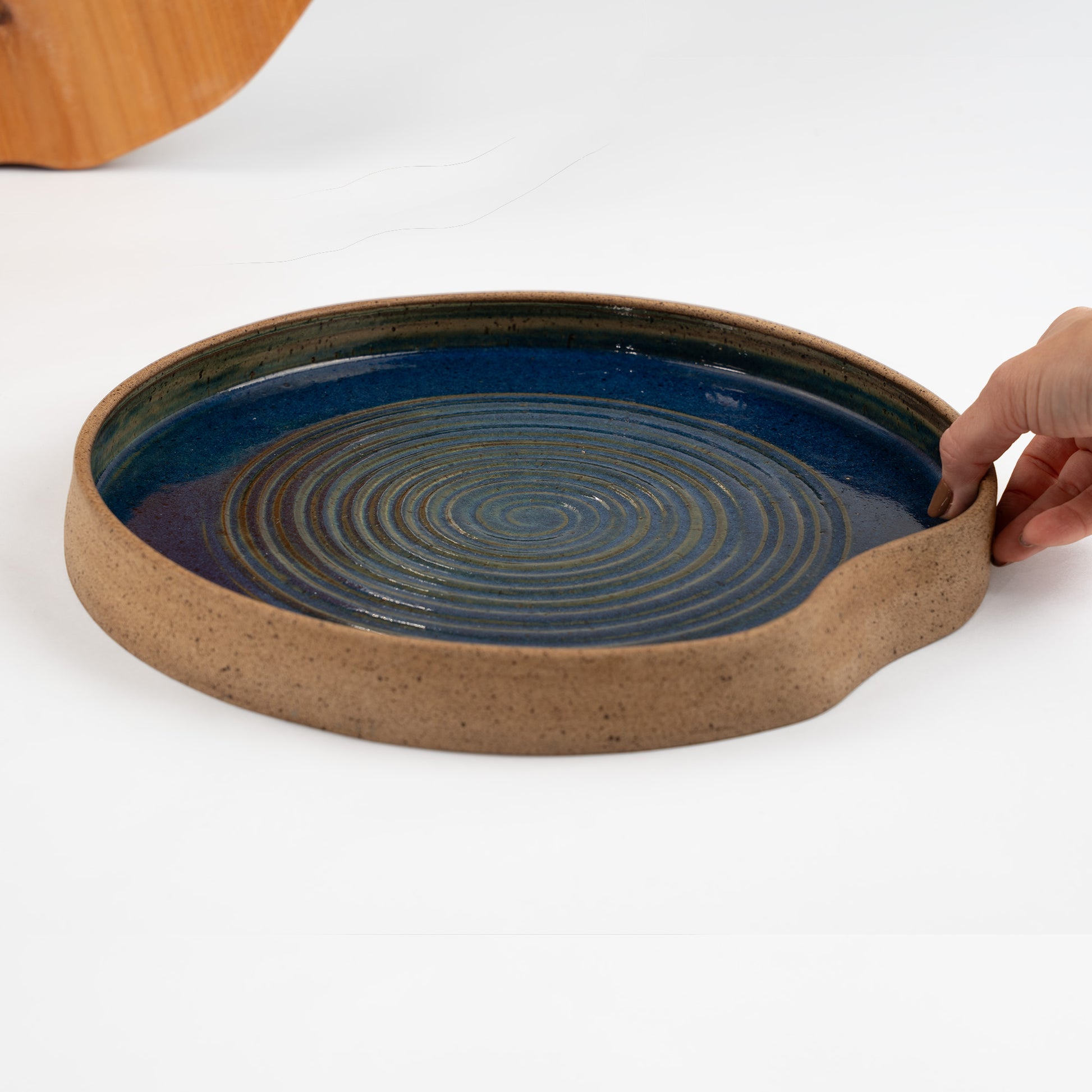 Travessa redonda de 32cm com borda reta e formato orgânico, feita em cerâmica artesanal com detalhe em espiral no centro. Ideal para servir pratos principais, saladas ou composições para receber, unindo funcionalidade e estética.