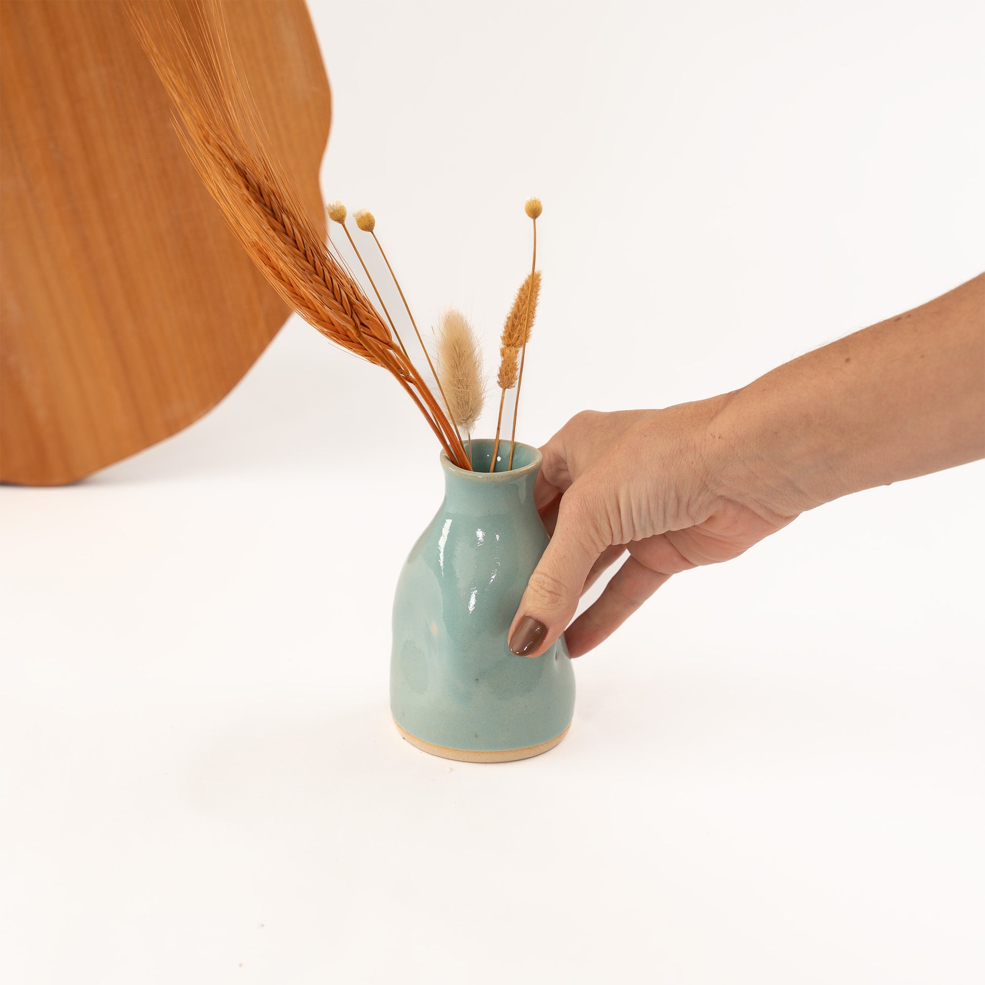 Vasinho Amassadinho em cerâmica artesanal, feito à mão com formato orgânico e um leve amassado nas laterais que dá personalidade e movimento à peça. Ideal para composições decorativas, pequenos arranjos secos ou como objeto solto na ambientação, ele valoriza o gesto manual e o acabamento único de cada queima.