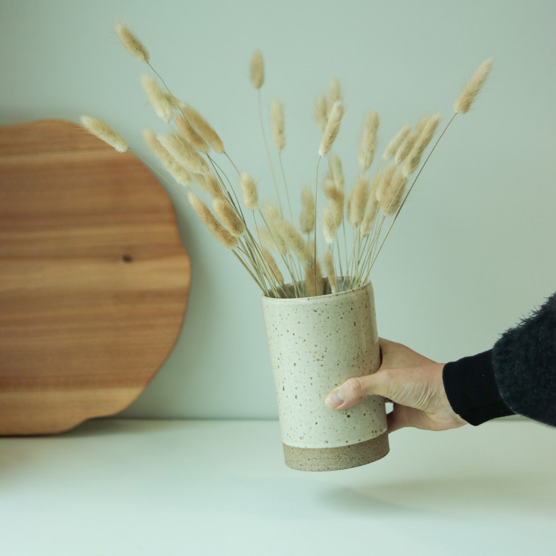 DescriçãoVaso Reto em cerâmica artesanal, feito à mão com silhueta cilíndrica e acabamento minimalista que destaca a forma pura do barro. Uma peça versátil, ideal para arranjos secos ou como objeto decorativo que traz equilíbrio e presença a qualquer ambiente. Disponível em diferentes massas e cores, o Vaso Reto é uma escolha elegante para composições simples, com identidade e expressão artesanal. Feito a mão: A matéria-prima ganha forma e identidade através do toque das mãos. Pequenas variações de tamanho, textura e tonalidade fazem parte dessa jornada, tornando cada criação exclusiva. A argila responde ao fogo de maneira singular, criando nuances e efeitos impossíveis de replicar em série.