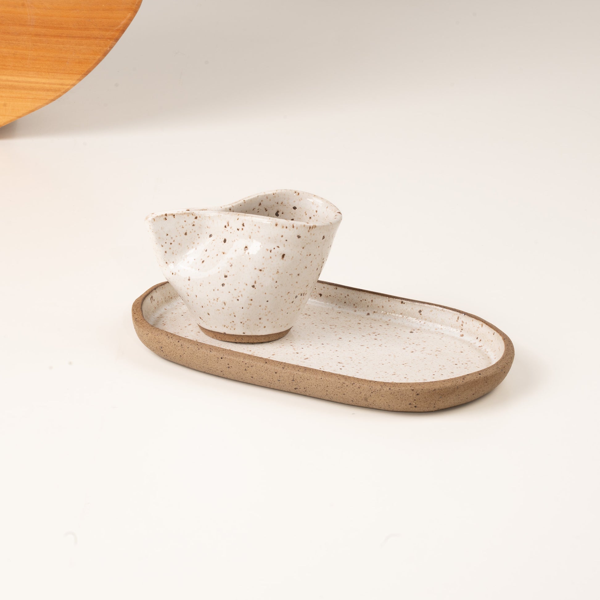 Xícara Andorinha com pires alongado em cerâmica artesanal, com design delicado e presença marcante. A xícara tem formato suave e confortável ao toque, enquanto o pires alongado acompanha com elegância, permitindo acomodar um pequeno acompanhamento, colher ou apenas compor visualmente a cena com mais leveza.