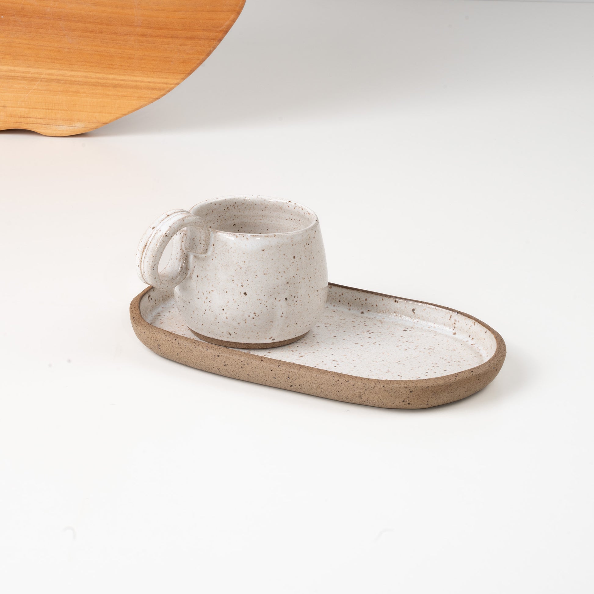 DescriçãoXícara Cumbuca com Alça em Laço com pires alongado em cerâmica artesanal é perfeita para cafés, chás ou infusões servidos com estilo e presença. A forma generosa da cumbuca se encaixa bem nas mãos, enquanto a alça em laço garante conforto e delicadeza no uso. Feita à mão, essa peça une funcionalidade e beleza em cada detalhe. O pires alongado complementa a composição com elegância, criando espaço para apoiar um pequeno doce, colher ou acompanhamento. Um conjunto que valoriza o momento da pausa e torna o ato de servir ainda mais especial. Feito a mão: A matéria-prima ganha forma e identidade através do toque das mãos. Pequenas variações de tamanho, textura e tonalidade fazem parte dessa jornada, tornando cada criação exclusiva. A argila responde ao fogo de maneira singular, criando nuances e efeitos impossíveis de replicar em série.