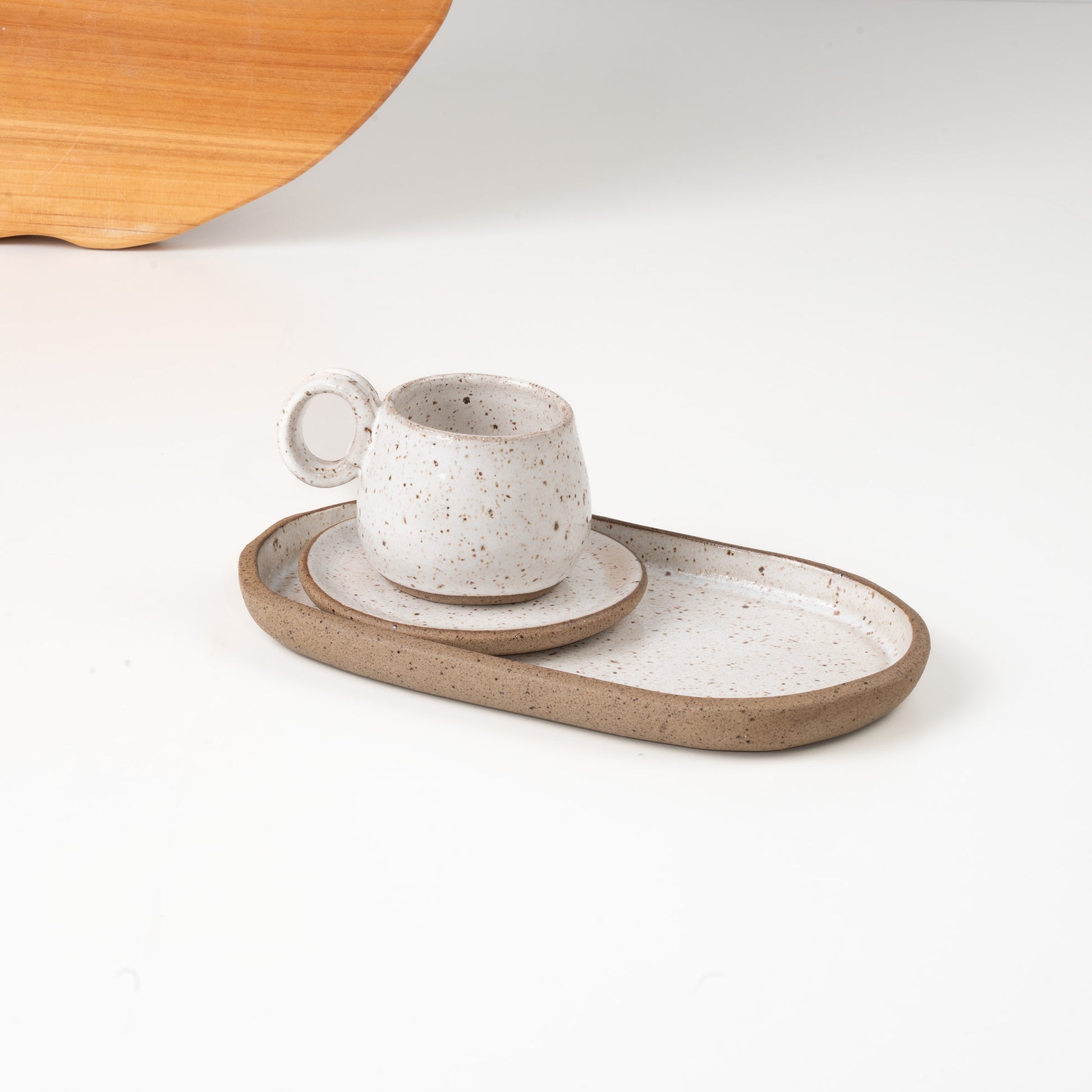 Feita à mão, essa peça une estética e praticidade. O pires tradicional acomoda a xícara com segurança, enquanto o pratinho alongado pode receber um doce, biscoito ou colher, tornando o momento da pausa ainda mais especial. Uma escolha que valoriza os pequenos detalhes do cotidiano.