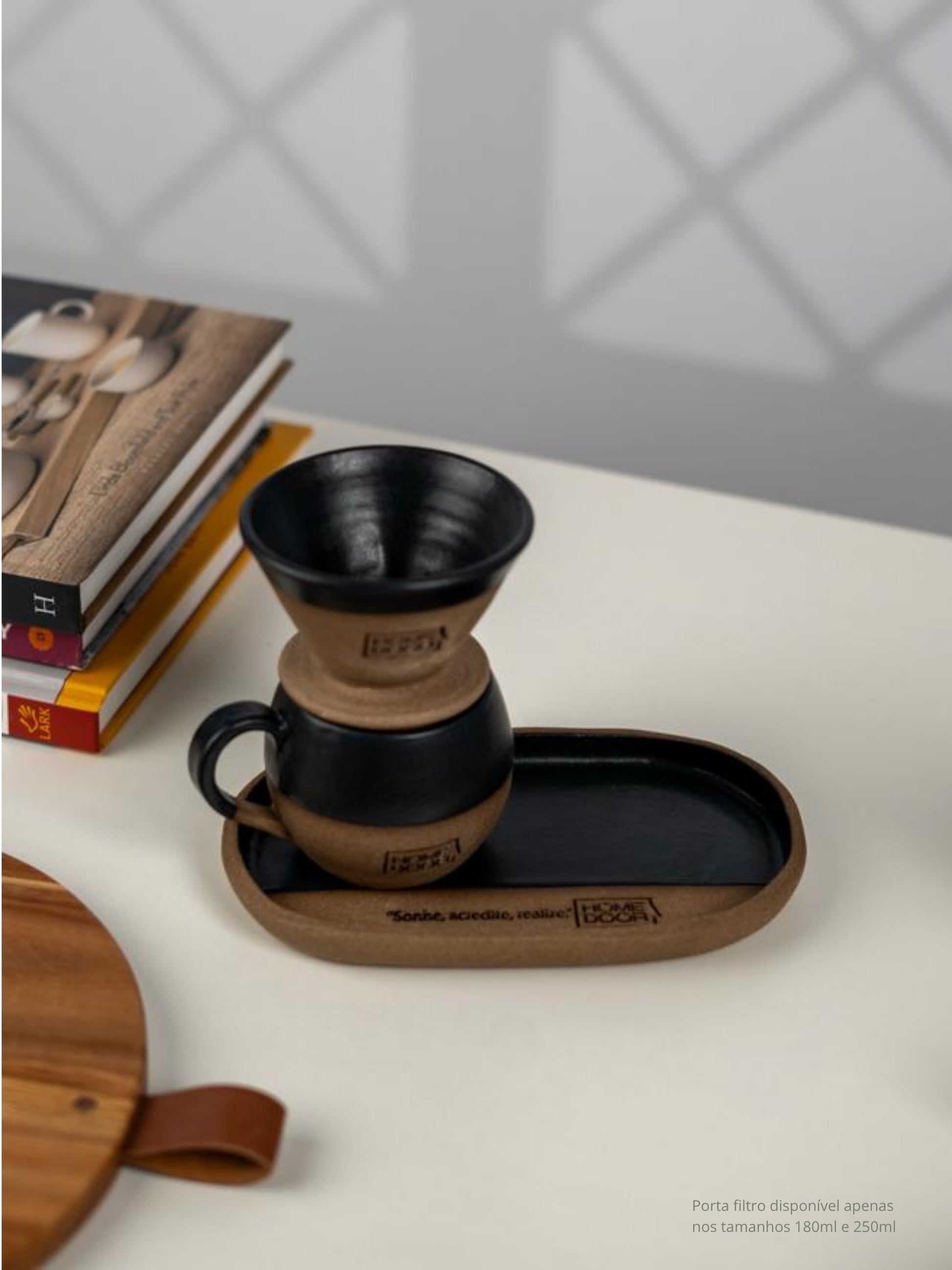 DescriçãoXícara Esfera com pires alongado e porta filtro em cerâmica artesanal personalizada, feita à mão para compor um conjunto autoral e funcional. A xícara com alça esférica oferece conforto ao uso e presença na mesa, enquanto o pires alongado permite servir acompanhamentos com delicadeza. O porta filtro complementa o conjunto, trazendo praticidade e beleza ao momento do preparo do café. Disponível em diferentes massas e cores, essa peça personalizada une estética, utilidade e afeto — perfeita para presentes e experiências únicas à mesa. Feito a mão: A matéria-prima ganha forma e identidade através do toque das mãos. Pequenas variações de tamanho, textura e tonalidade fazem parte dessa jornada, tornando cada criação exclusiva. A argila responde ao fogo de maneira singular, criando nuances e efeitos impossíveis de replicar em série.