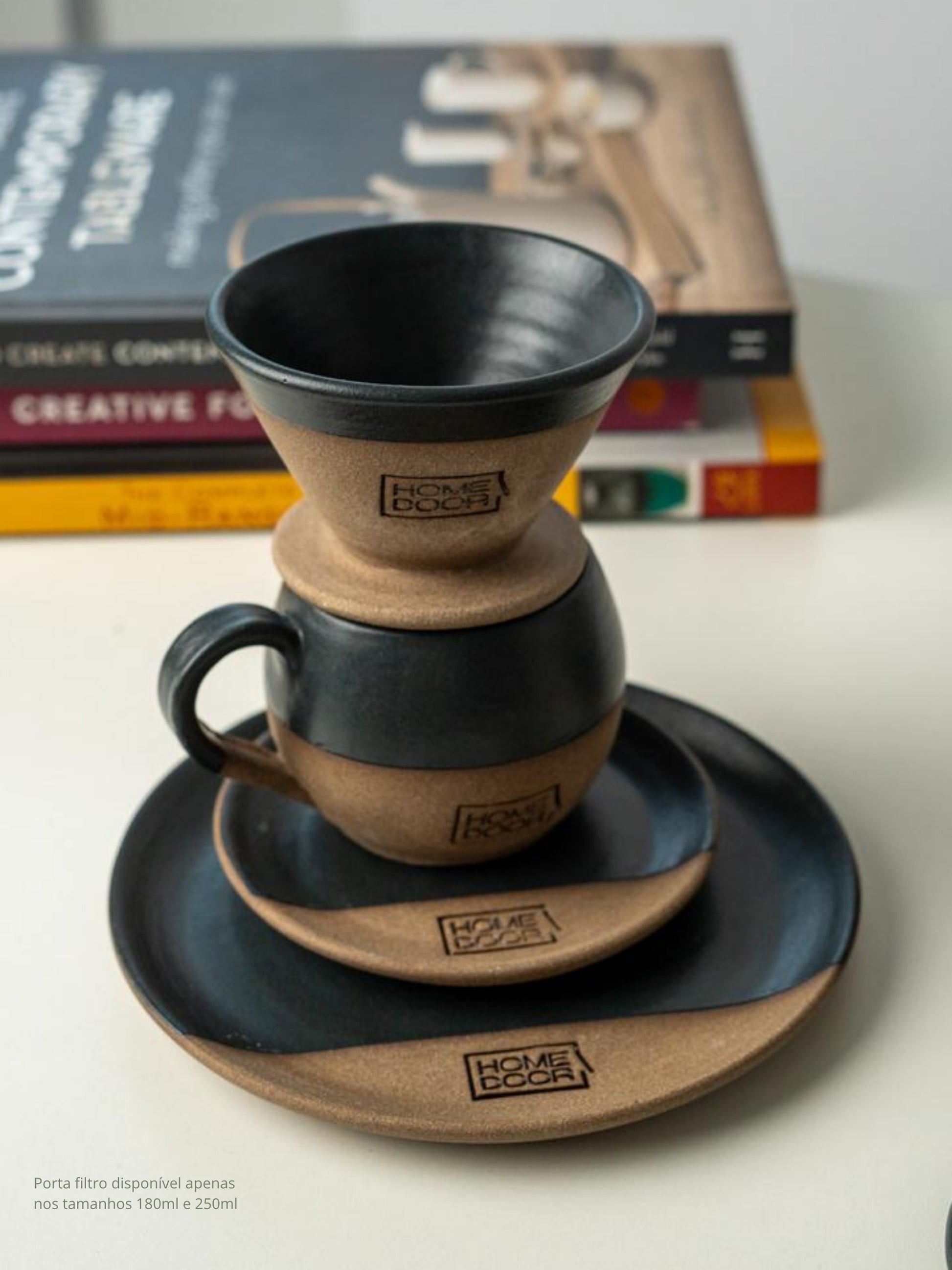 DescriçãoXícara Esfera com porta filtro e prato de sobremesa em cerâmica artesanal personalizada, feita à mão em composição funcional e cheia de afeto. A xícara arredondada com alça escultural traz conforto e estilo, enquanto o porta filtro valoriza o preparo do café com beleza e praticidade. O prato de sobremesa orgânico completa o conjunto com elegância e versatilidade para servir doces, frutas ou acompanhamentos. Disponível em diferentes massas e cores, é uma peça autoral que pode ser personalizada com nomes, palavras ou símbolos — perfeita para presentes únicos e momentos especiais. Feito a mão: A matéria-prima ganha forma e identidade através do toque das mãos. Pequenas variações de tamanho, textura e tonalidade fazem parte dessa jornada, tornando cada criação exclusiva. A argila responde ao fogo de maneira singular, criando nuances e efeitos impossíveis de replicar em série.