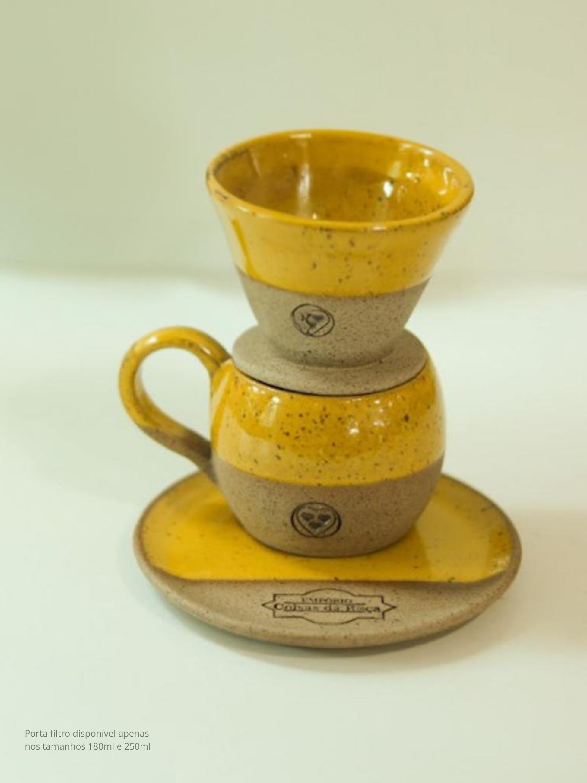 DescriçãoXícara Esfera com porta filtro em cerâmica artesanal personalizada, feita à mão para compor um conjunto afetivo e funcional. A xícara com formato arredondado e alça escultural oferece conforto e presença, enquanto o porta filtro completa a experiência do café com autenticidade e charme artesanal. Essa peça autoral está disponível em diversas massas e cores, podendo ser personalizada com nomes, palavras ou símbolos — ideal para presentes especiais ou composições únicas à mesa. Feito a mão: A matéria-prima ganha forma e identidade através do toque das mãos. Pequenas variações de tamanho, textura e tonalidade fazem parte dessa jornada, tornando cada criação exclusiva. A argila responde ao fogo de maneira singular, criando nuances e efeitos impossíveis de replicar em série.